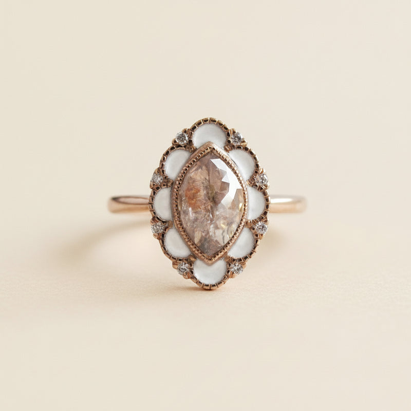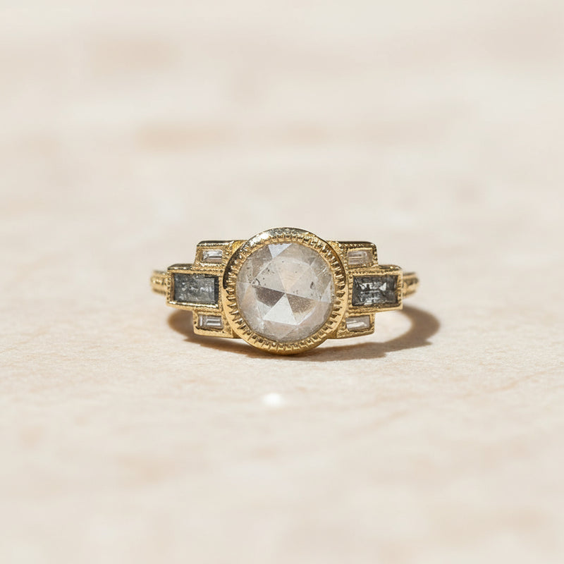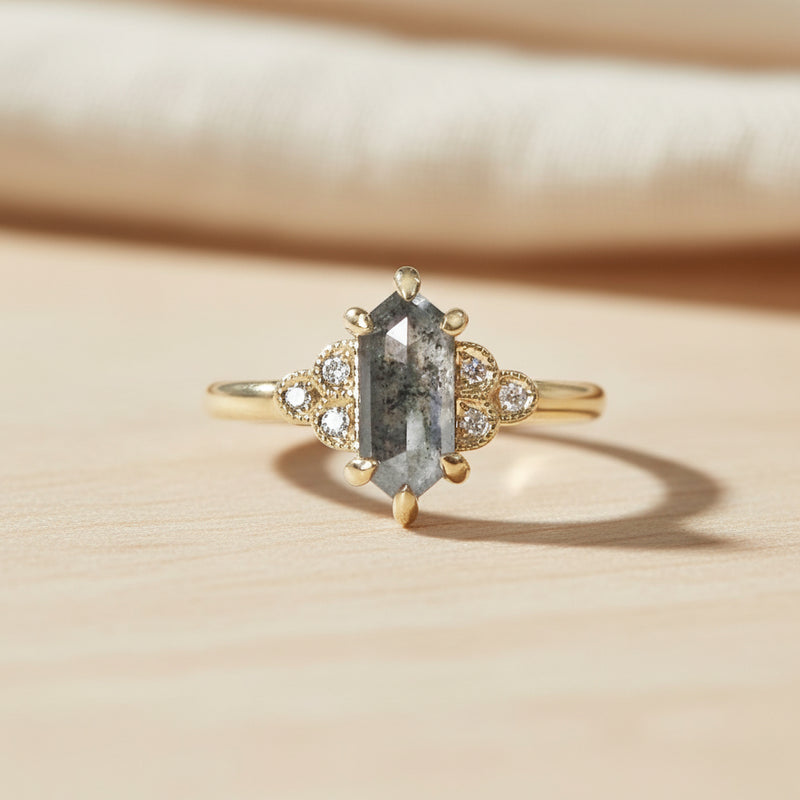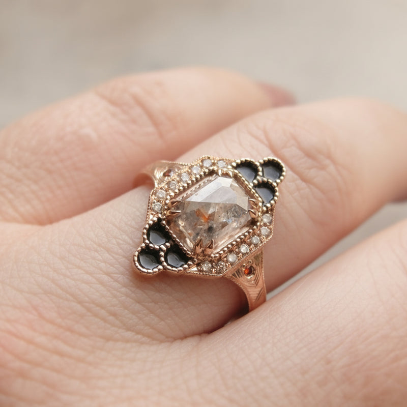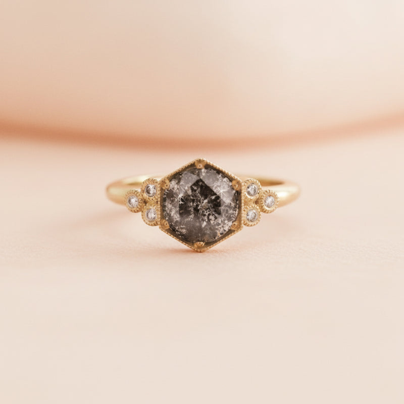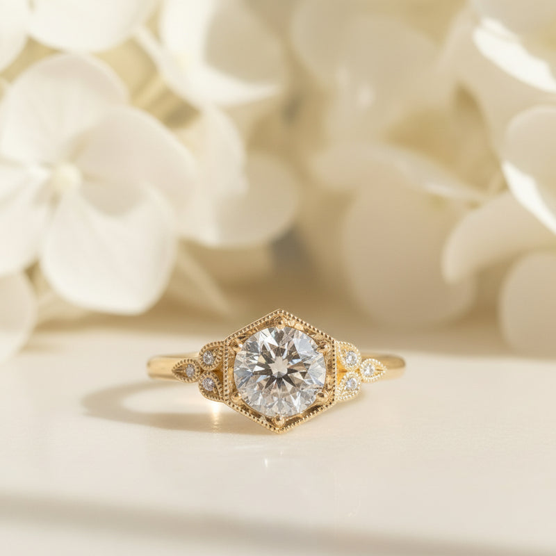 A custom Wexgold hexagon solitaire with miligrain in rose gold can be soon ordered in our ring builder. Starting from $2500CAD (plus cost of centre stone)