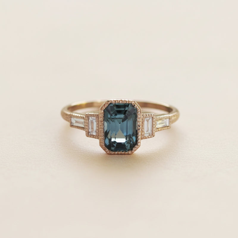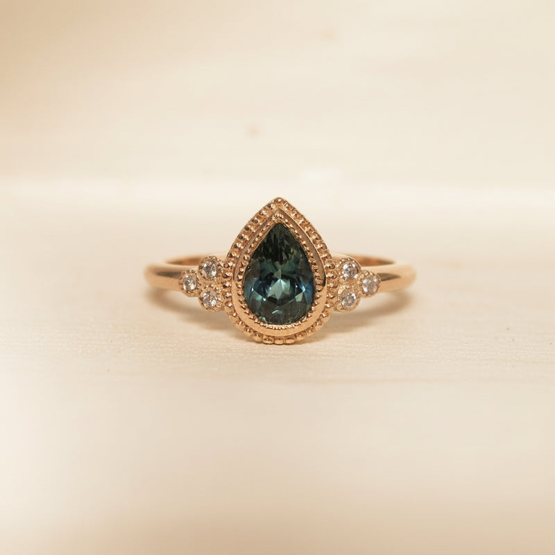 A custom snowdrop ring with delicate trillium design and Montana Sapphire can be soon ordered in our ring builder. Starting from $3000CAD (plus cost of centre stone)