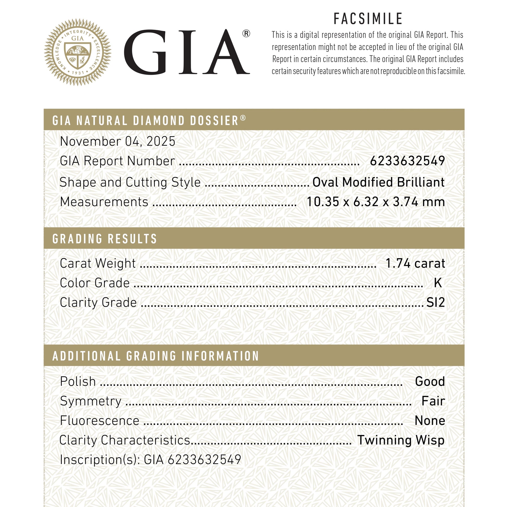 1.75ct 10.34x6.31x3.7.4mm GIA SI2 K Antique Moval Brilliant 27409-01