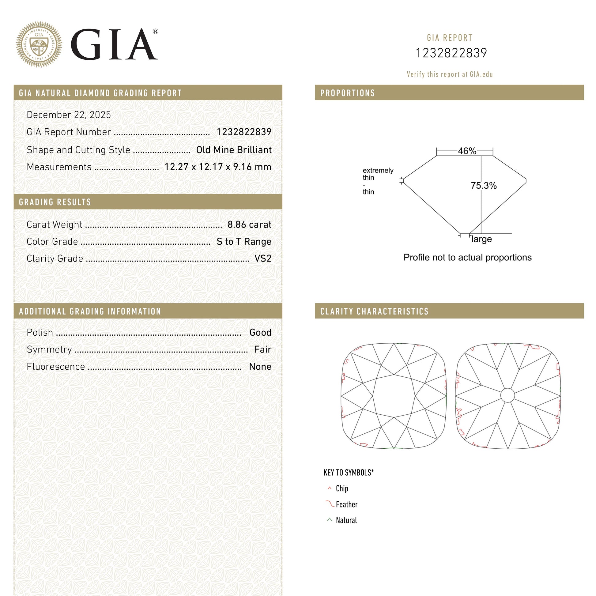 8.86ct 12.26x12.17x9.14mm GIA VS2 S-T Antique Old Mine Cut 27425-01