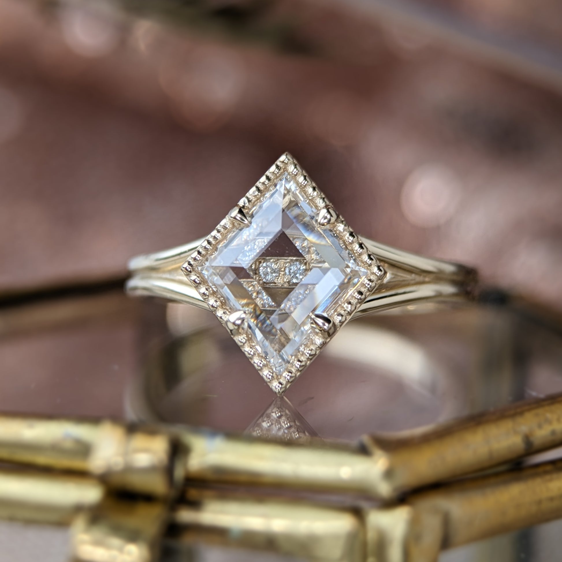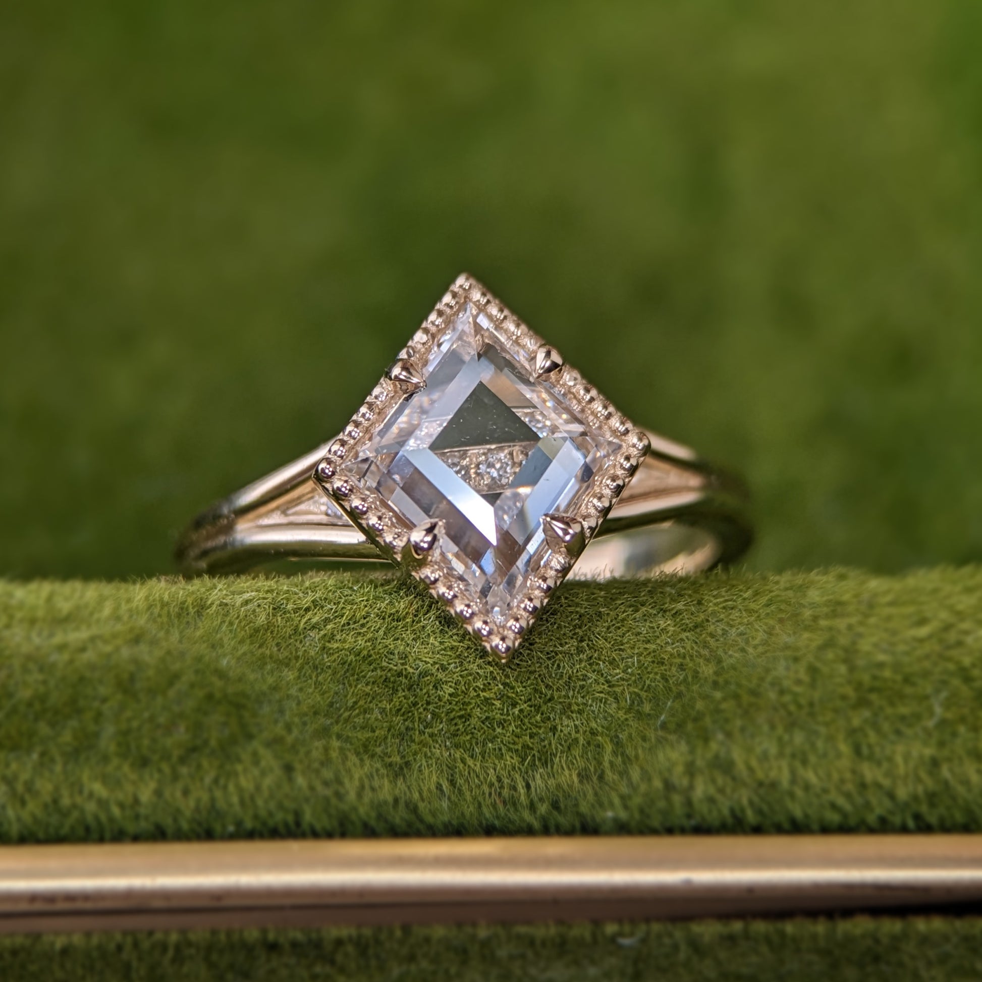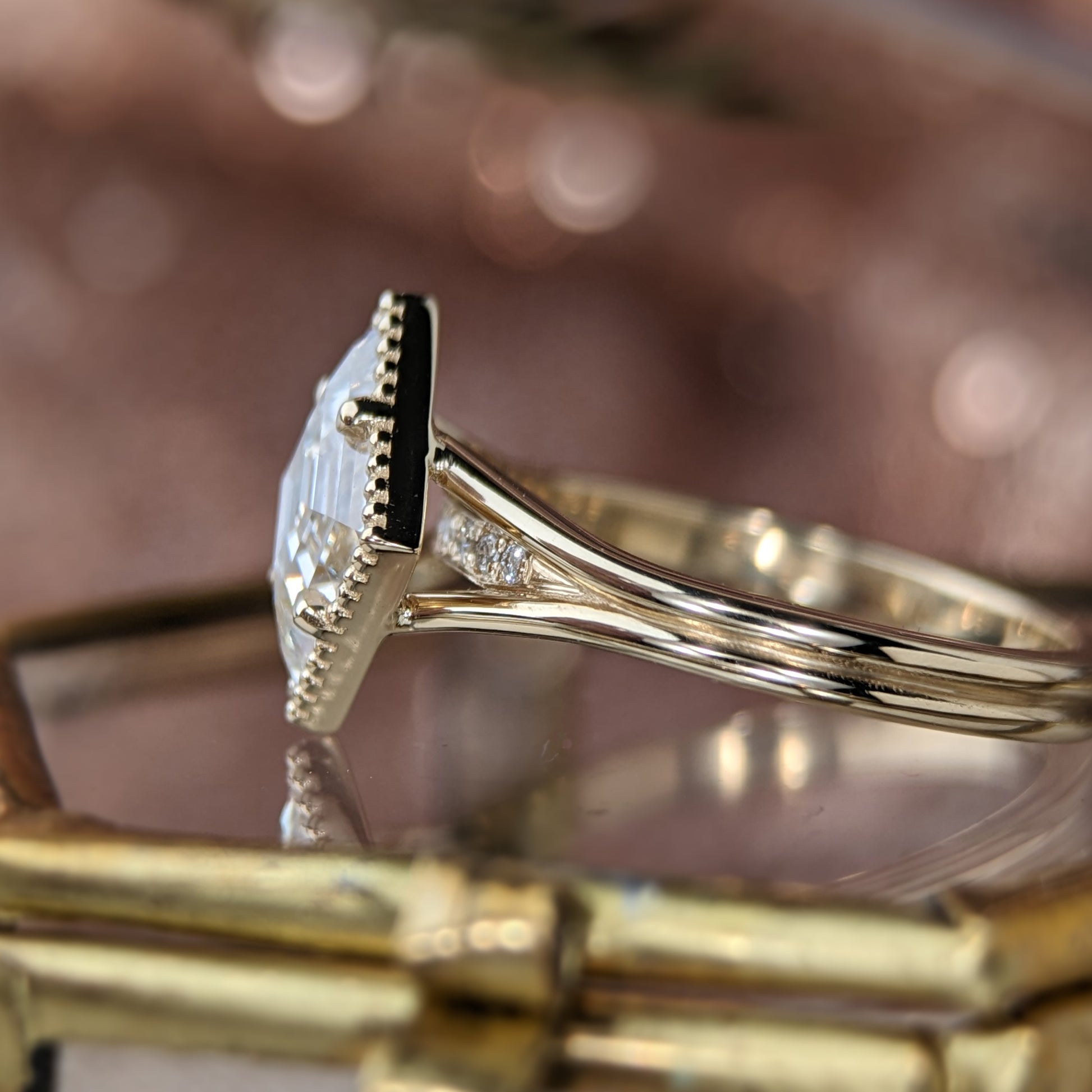 This exquisite custom ring is a testament to modern elegance and eco-conscious luxury. At the heart of this whimsical engagement ring is a super crisp lab grown diamond, a sustainable choice that offers brilliance akin to that of a natural diamond. The ring's signature split shank style is a marvel of design, gracefully parting to reveal a hidden row of glistening diamonds beneath the portrait cut centerpiece. The fluidity of the band, combined with the precision of claw prongs and the delicate dotted miligrain frame, culminates in a wearable work of art that is as unique as your love story.