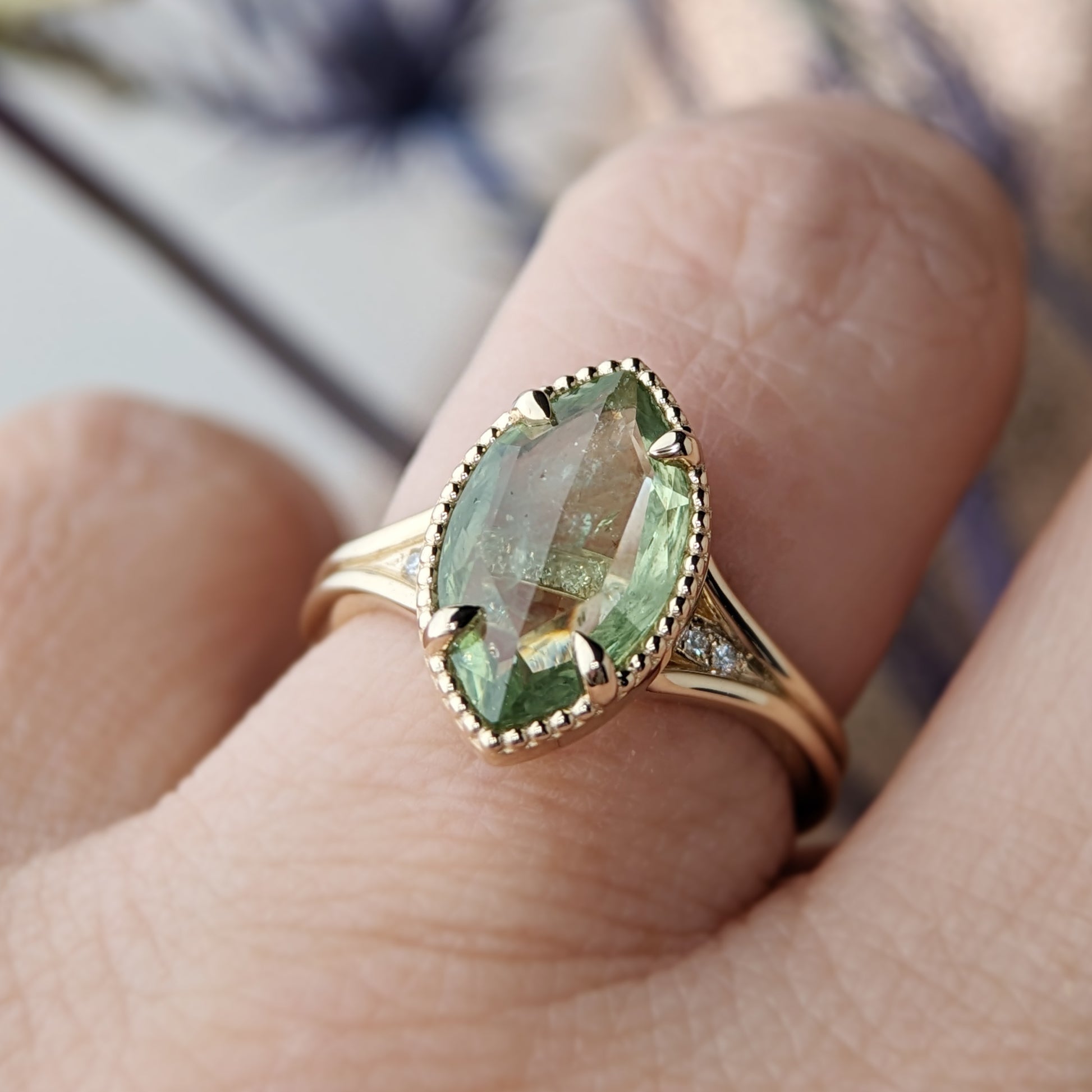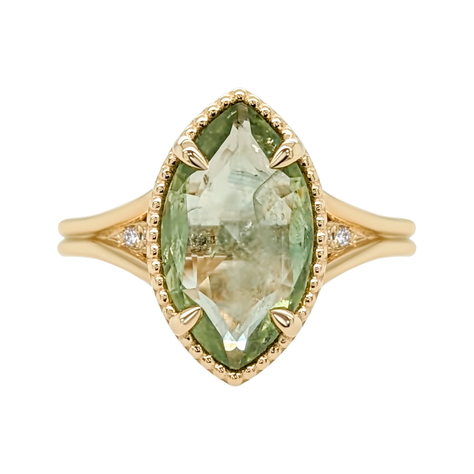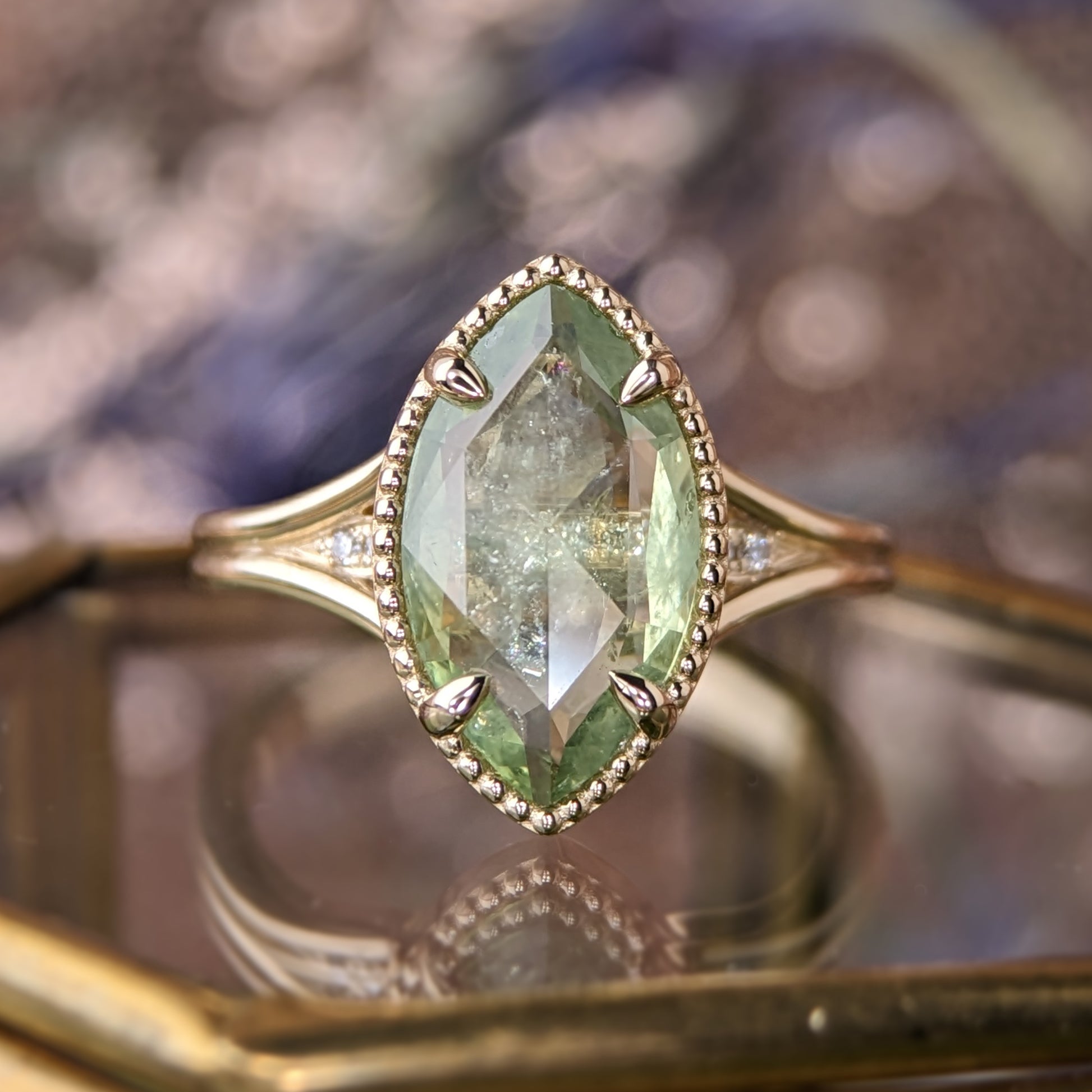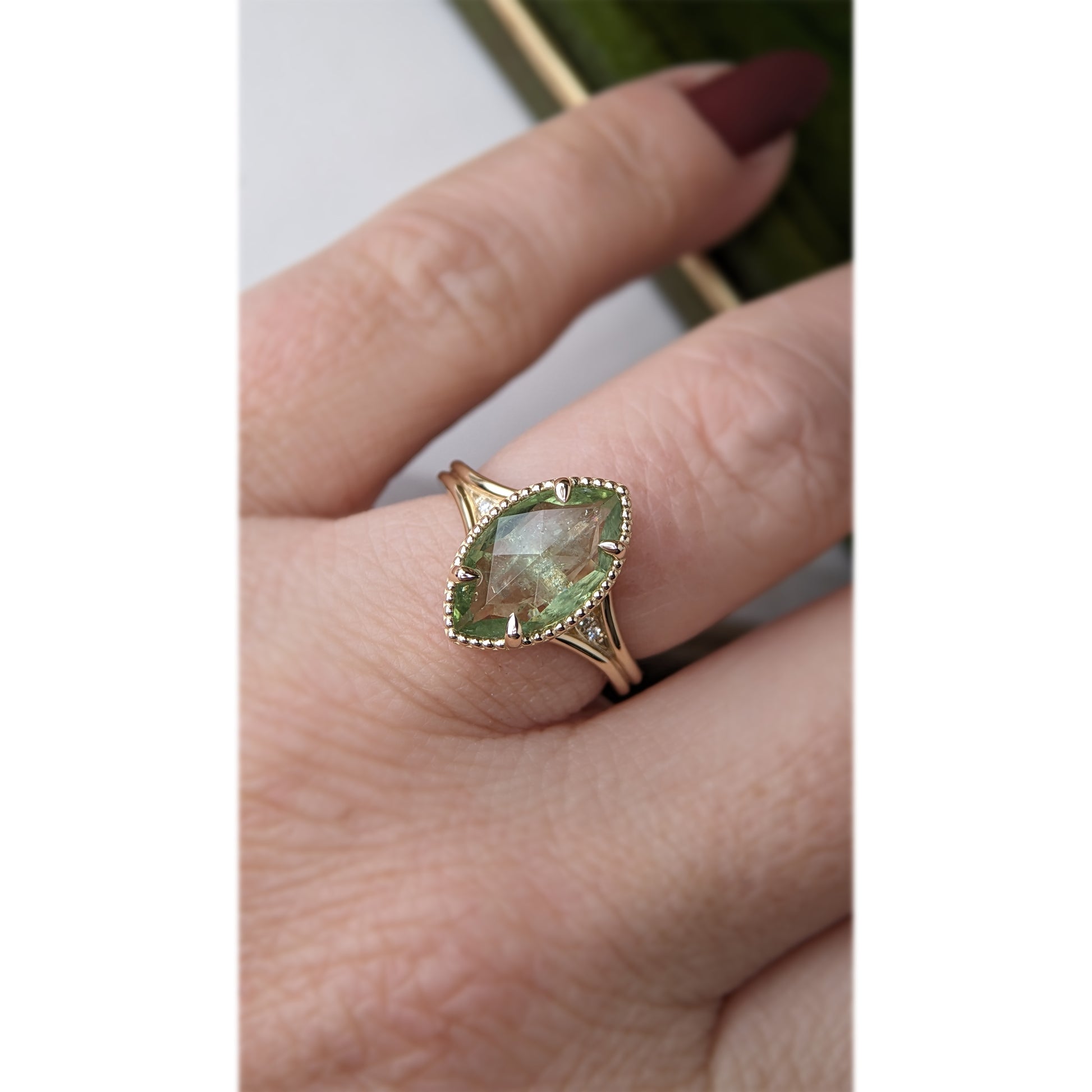 The ring's split shank design is a treasure trove of detail, revealing a hidden row of sparkling diamonds beneath an antique-style rosecut. The fluidity of the band, the precision of the claw prongs, and the delicate dotted milgrain frame come together in a symphony of design, creating a green sapphire ring that's not just a piece of jewelry but a wearable work of art.