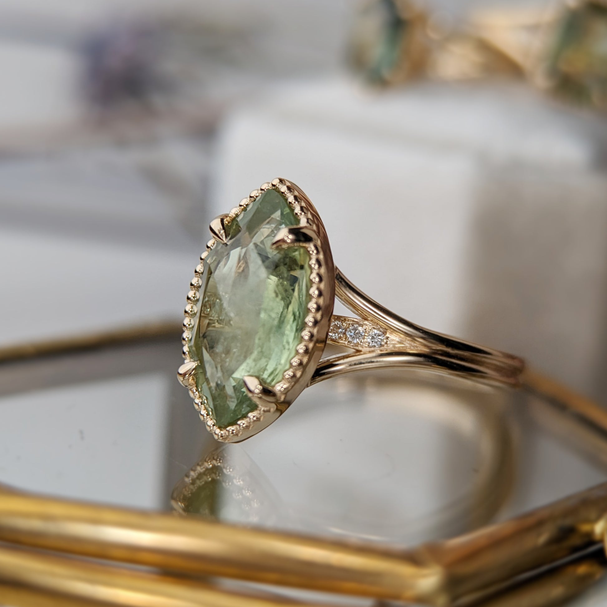 Embark on a journey to the heart of the Rocky Mountains with our exquisite Montana Sapphire engagement ring, where the allure of the great outdoors is captured in the fresh green hue of a rare gemstone. This isn't your everyday sapphire; it's a marvel of nature, reminiscent of muddled herbs in a refreshing cocktail, its natural inclusions adding a touch of whimsy and earthy charm.
