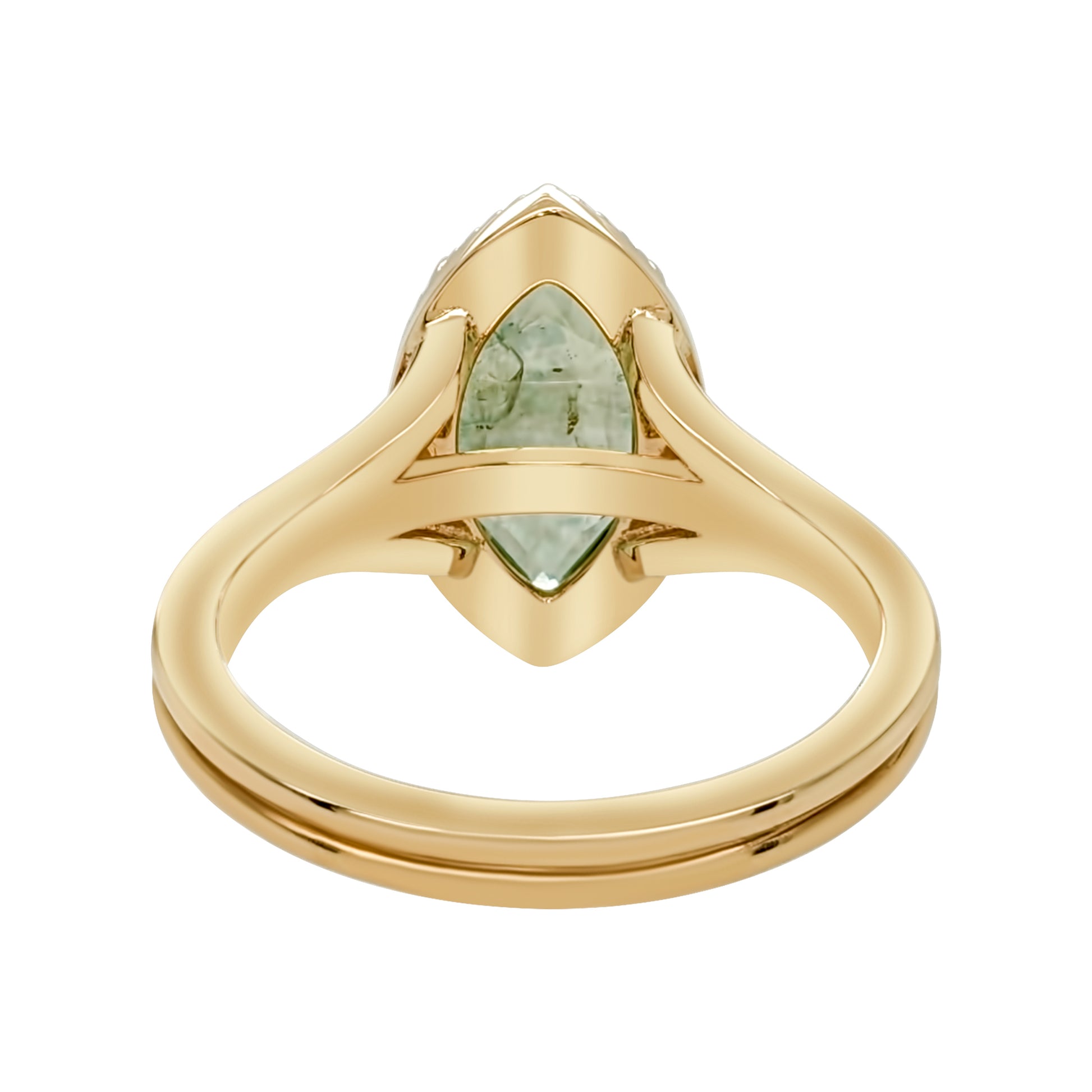 Imagine a Green Sapphire, vibrant like a peridot yet with the prestige of sapphire lineage, cradled in an antique style engagement ring that whispers tales of timeless romance. This nearly 3 carat sapphire ring is a statement of elegance and grandeur, with a marquise-cut Montana Sapphire that's larger than life, commanding attention while maintaining an air of grace and sophistication.