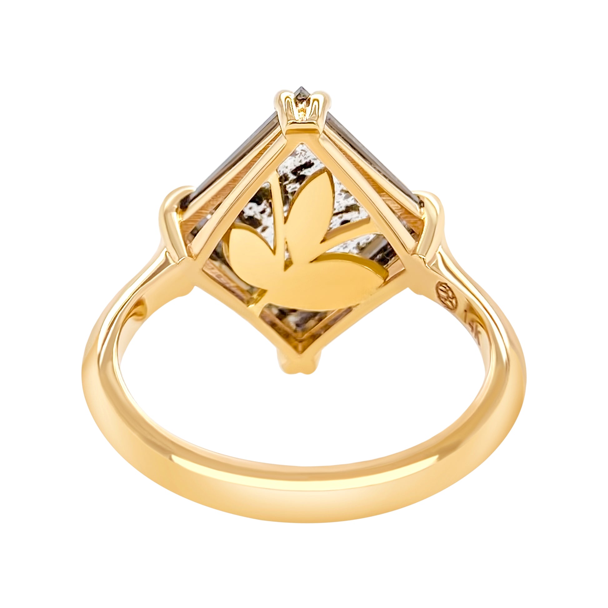 Center stage is taken by a sexy kite shaped diamond, a cut that's as edgy as it is elegant. The salt and pepper diamond is a celebration of natural beauty, with inclusions that create a unique texture and an electric essence reminiscent of the spirited black caipirinha cocktail from Brazil. This salt and pepper diamond ring is a tribute to the country's vivacious energy, a symbol of passion and zest for life.
