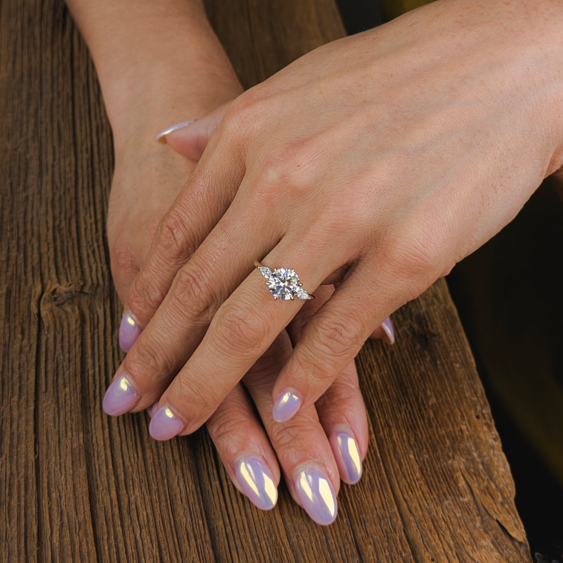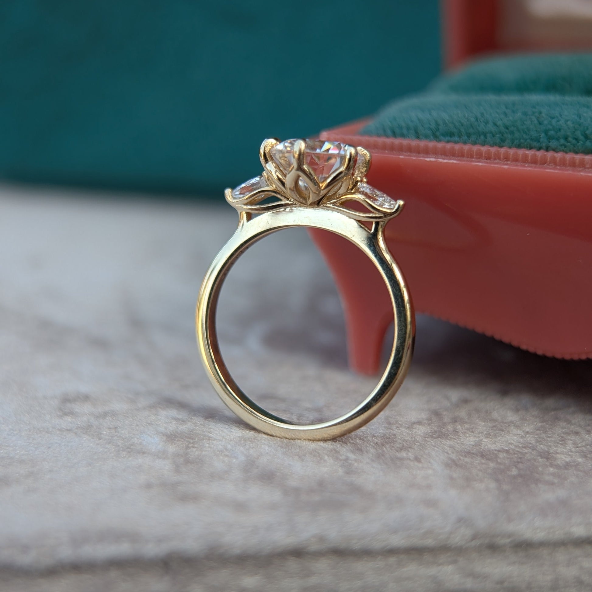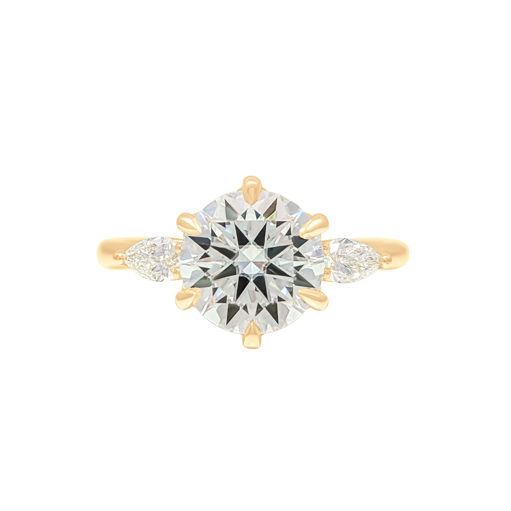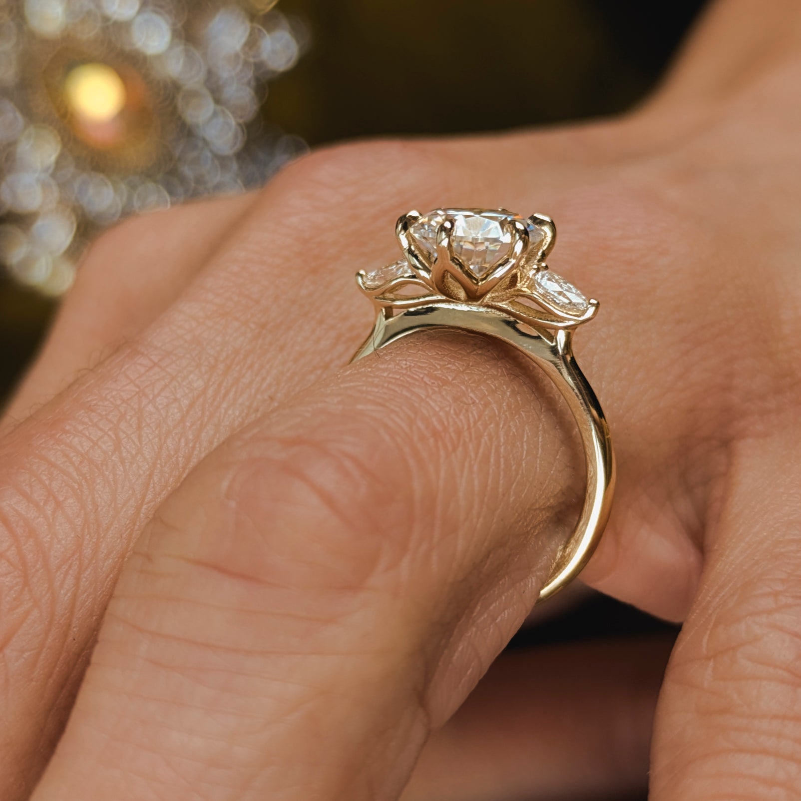 This floral design is a modern interpretation of a classic three-stone ring. The center stone is set in 6 prongs flanked by sparkling brilliant cut pear diamonds on either side. The intricate petals viewed from the side make this ring striking from every angle. This setting can be paired beautifully and worn with your favourite stacking rings with minimal gapping.