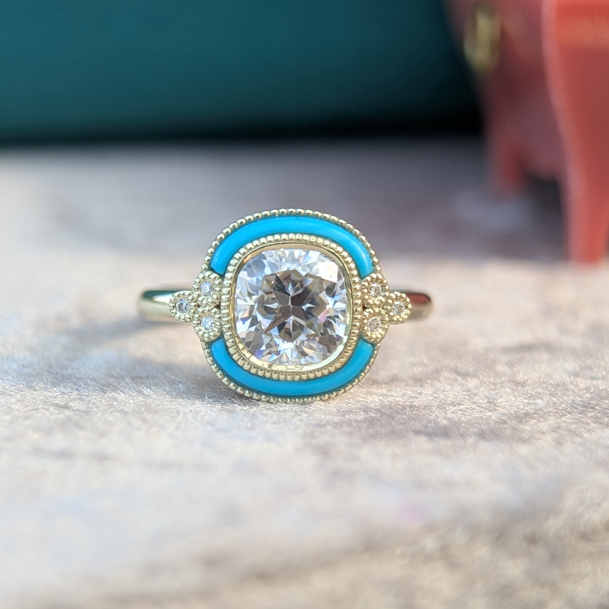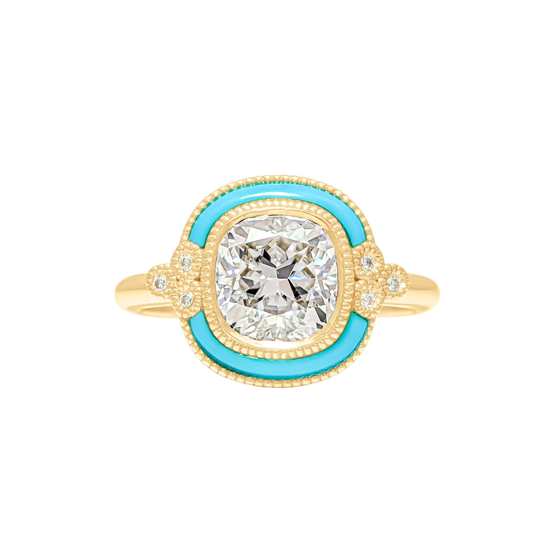 Create your perfect engagement ring with the Capri Kiss setting, featuring a stunning turquoise halo inlay that frames your center stone beautifully. Customize this setting and select your preferred gemstone and metal, making it uniquely yours. The inlay adds a distinctive edge and look of sophistication. Ideal for those seeking a personalized piece that reflects their bold style and vision.