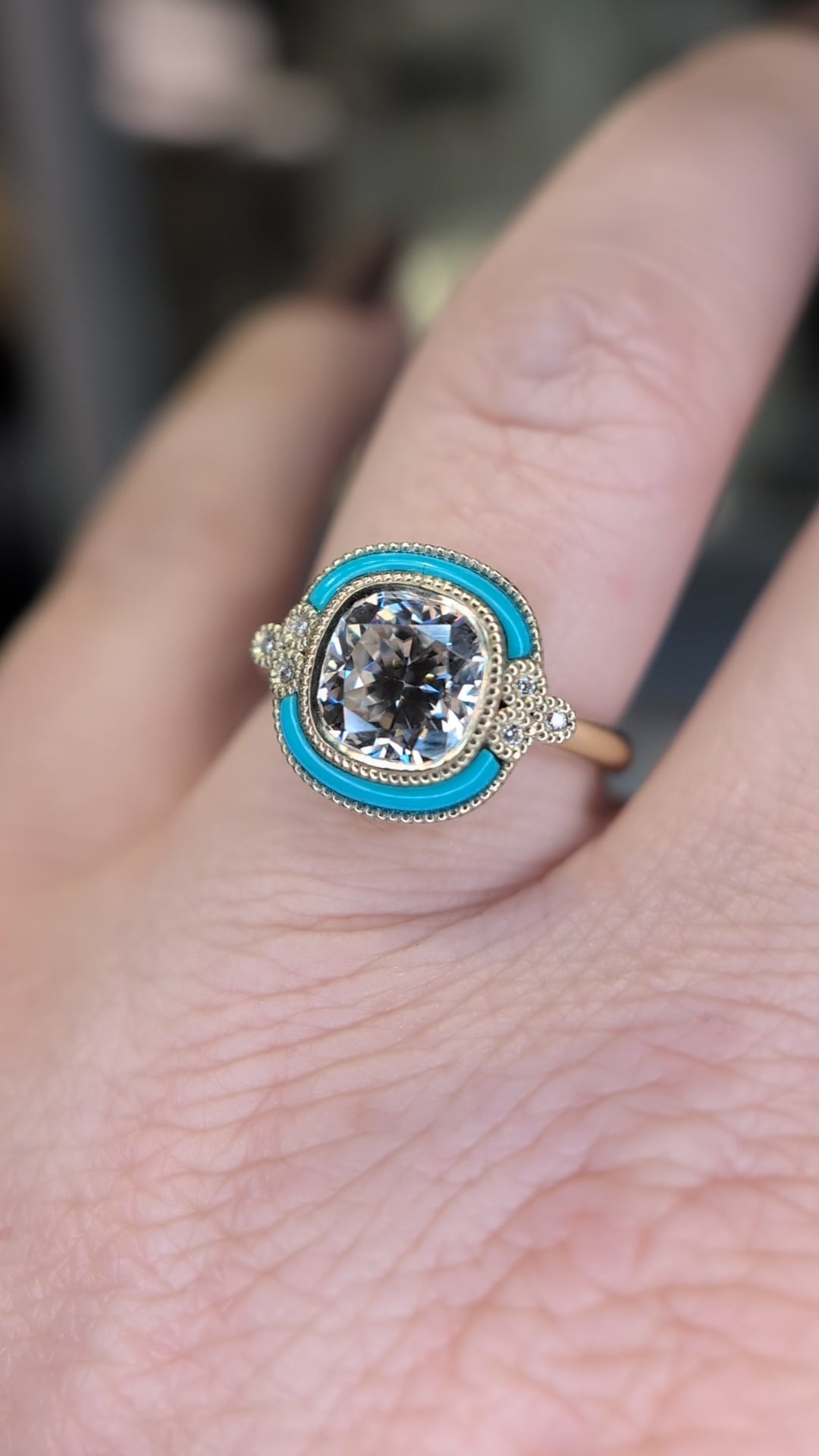 The Capri Kiss Setting evokes a sense of color, warmth, and craftsmanship — a modern heirloom born from artistry and individuality. Its turquoise or black onyx halo offers a luminous pop of contrast, framing your chosen gemstone in a vivid embrace. Milgrain edges and lab diamond accents lend a refined, vintage-inspired touch, while the cathedral silhouette lifts the center stone elegantly above the finger. Each detail is intentional — bold, timeless, and unmistakably EG Bespoke.