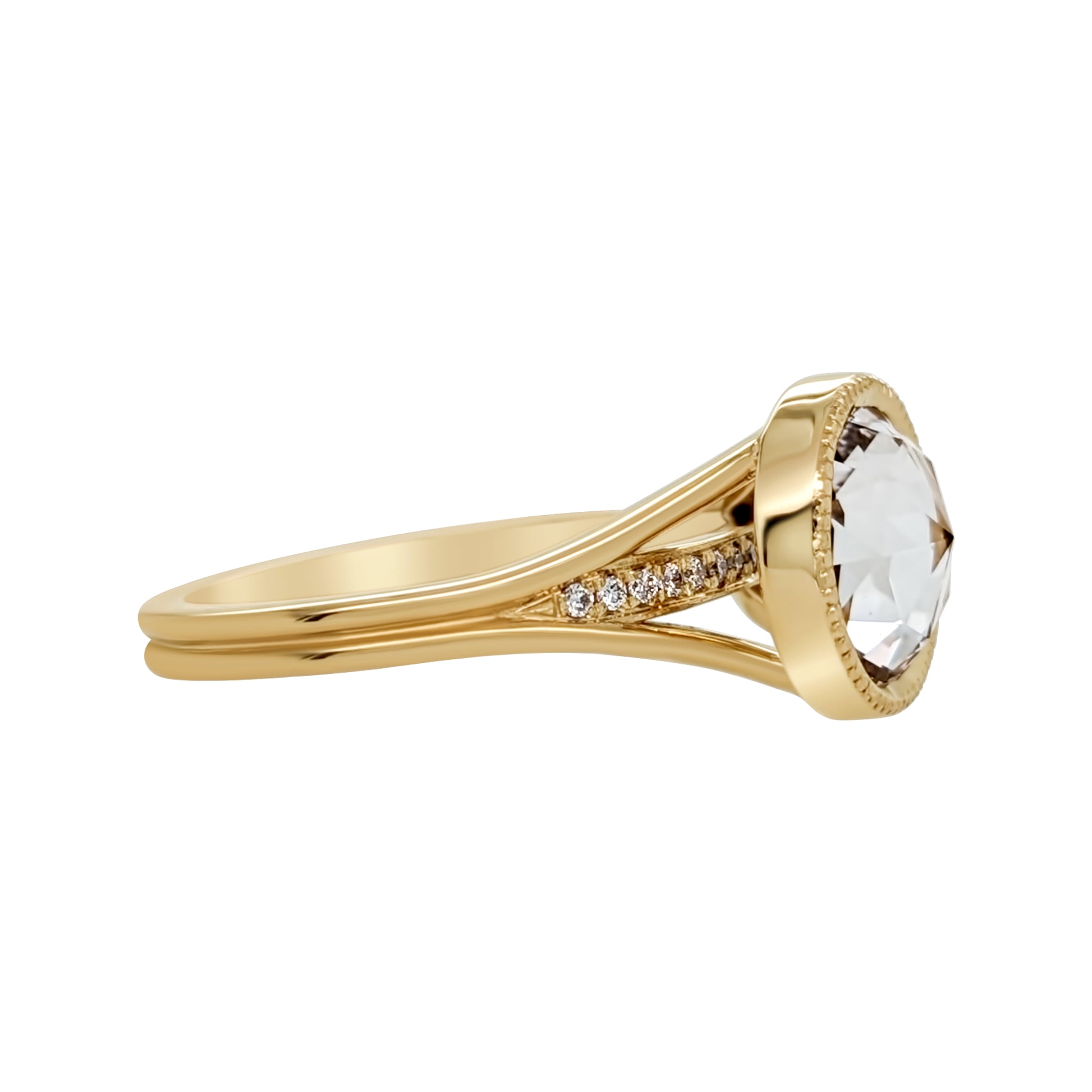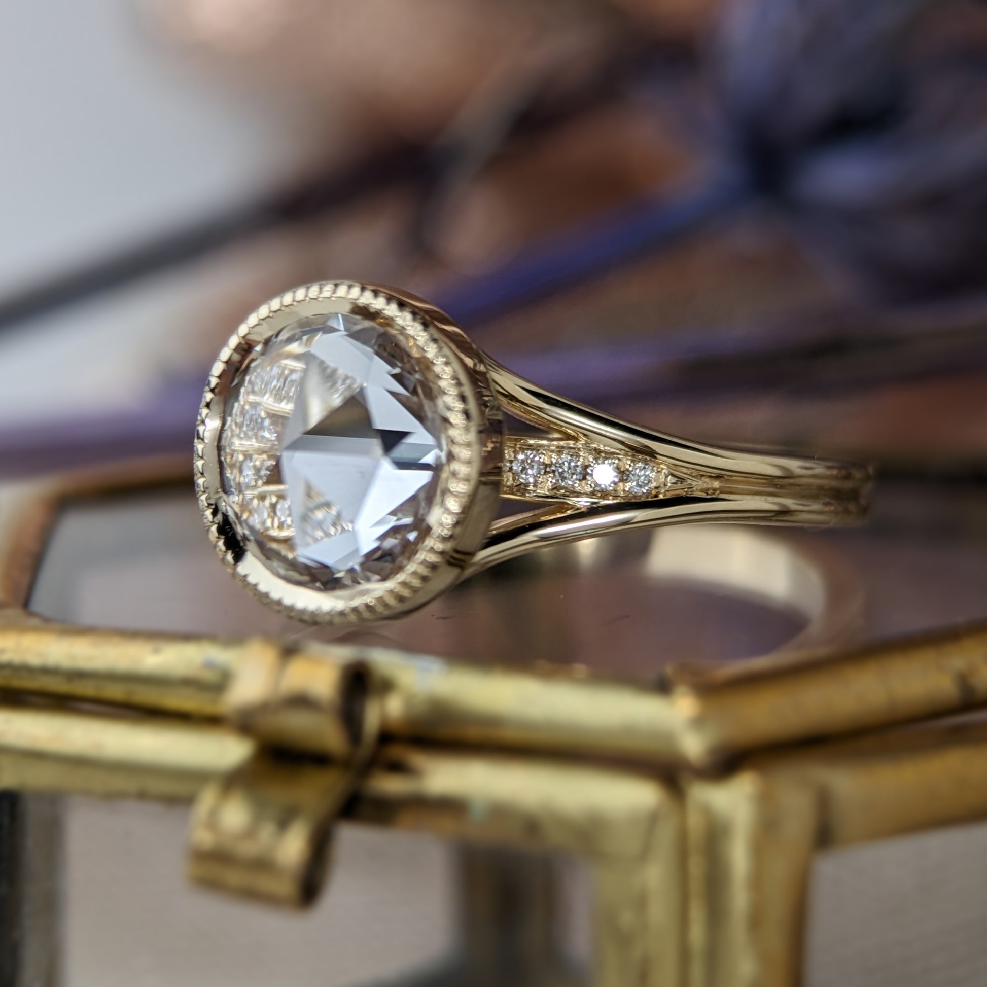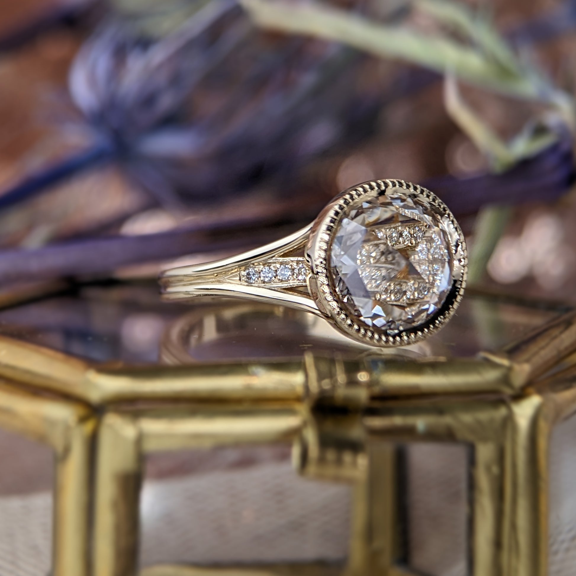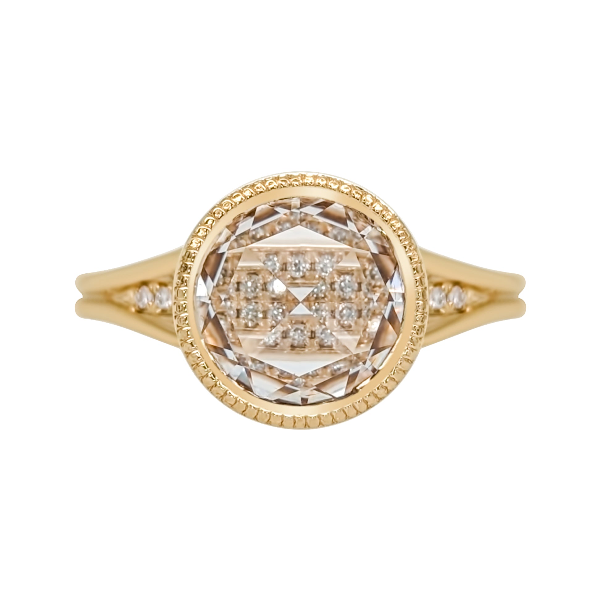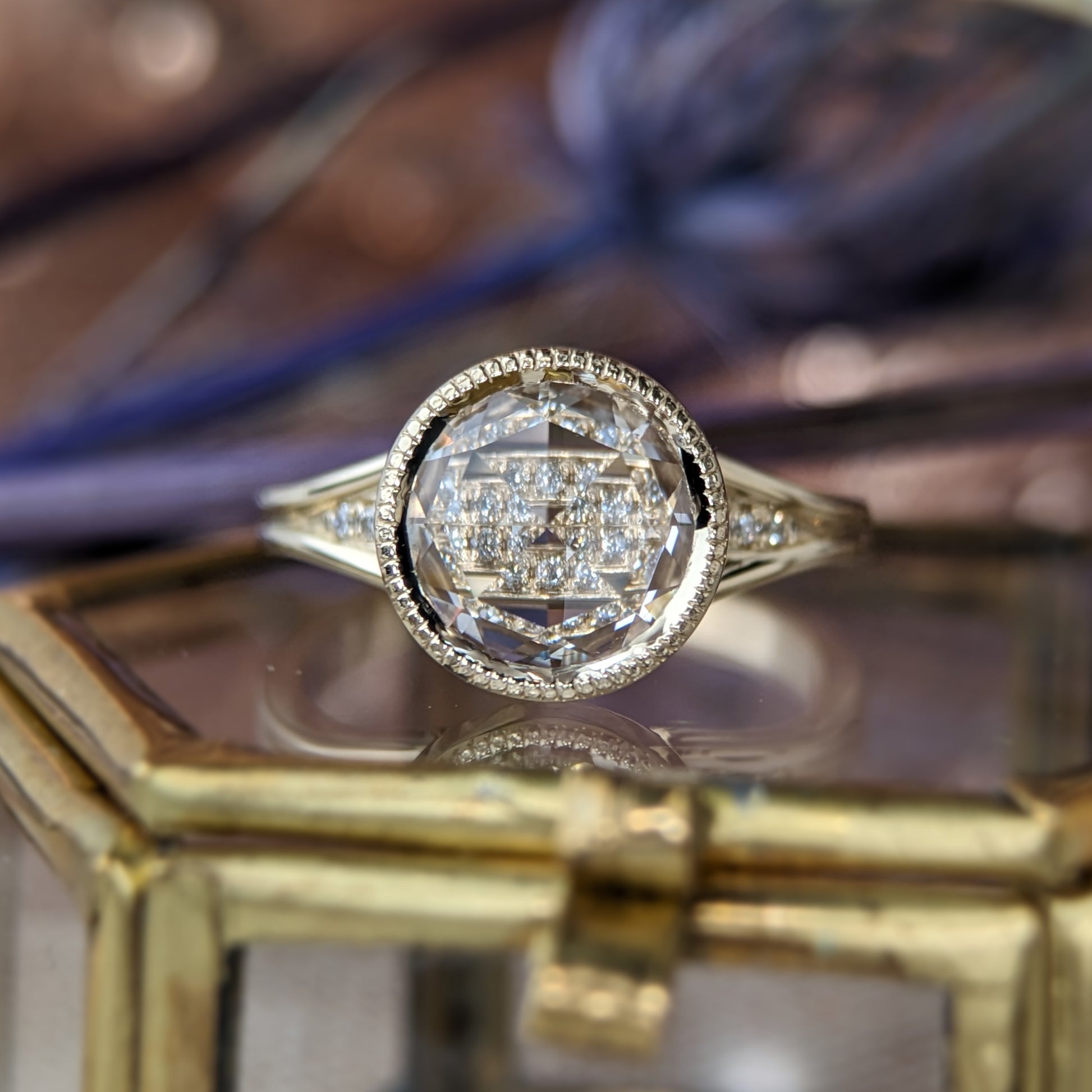 Step into a world where modern design meets timeless elegance with the Caroline split shank engagement ring, a piece destined to become a cherished family heirloom. At the heart of this exquisite ring lies a custom rose cut lab-created white sapphire, whose unique faceting creates a mesmerizing kaleidoscopic effect. As light dances through the precision-cut gem, it ignites the path of tiny diamond accents hidden beneath, crafting a spectacle of sparkle and sophistication. Whether it graces your hand as a stand-alone statement or mingles with your favorite jewelry pieces, the Caroline ring is an heirloom-in-the-making that will spark conversations and admiration for generations.