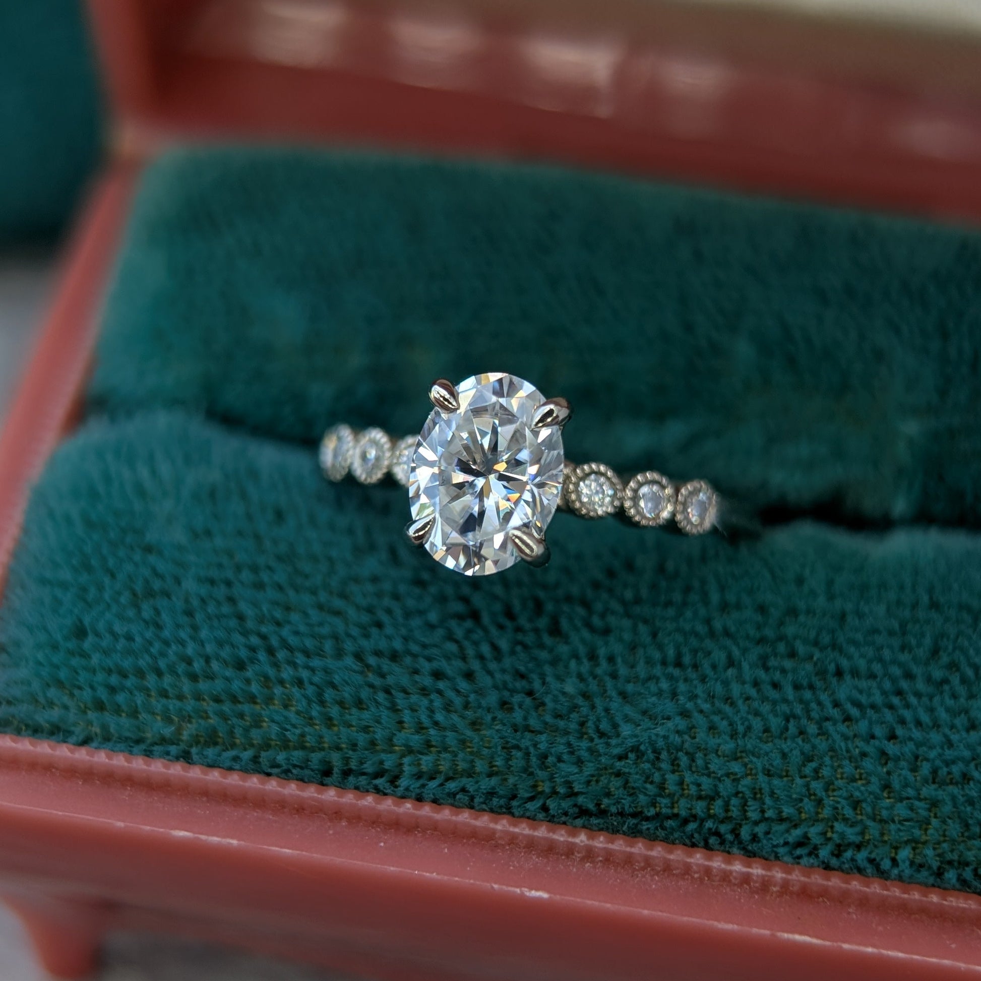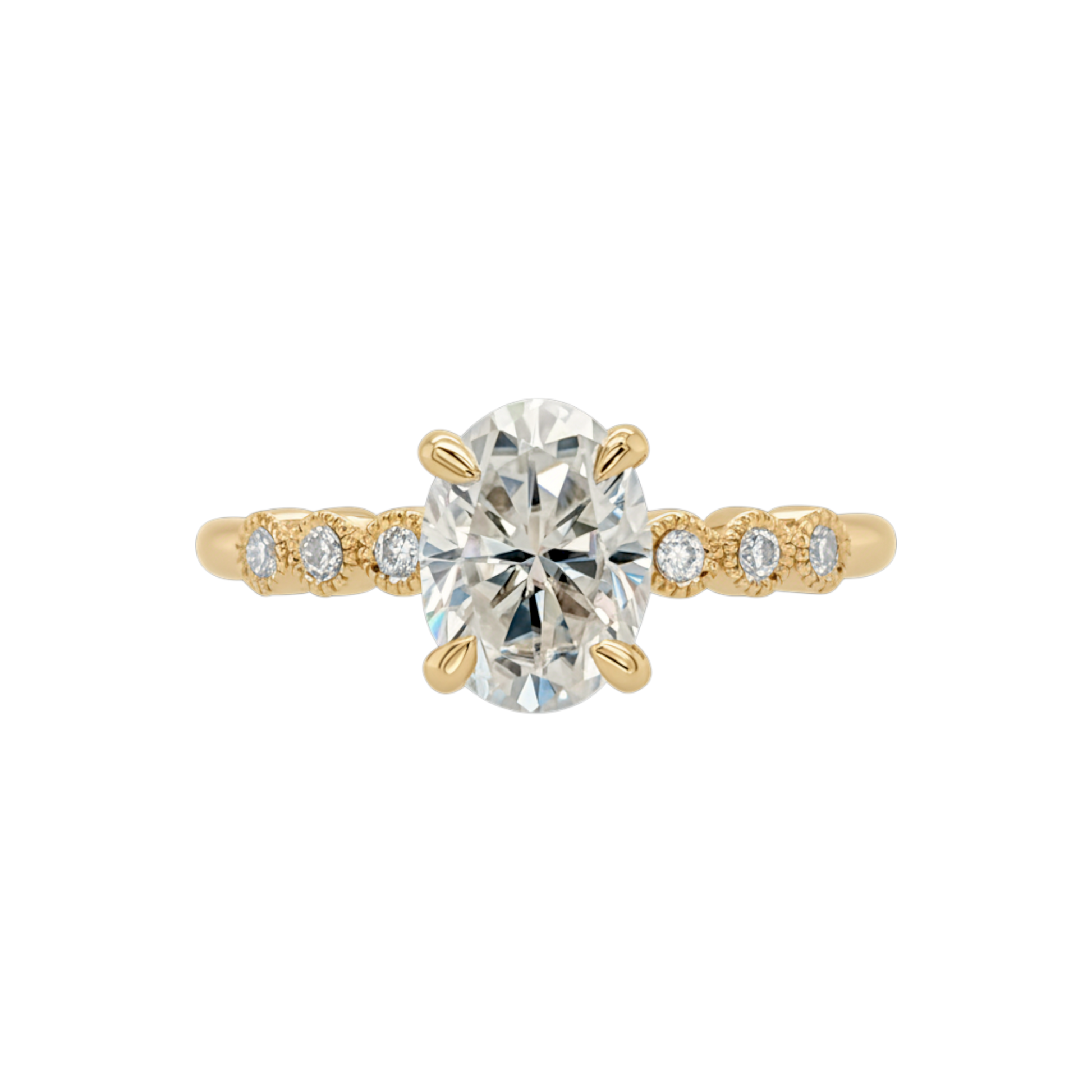 Grace's classic design ensures it will never go out of style. This stunning ring features a center stone, surrounded by miligrain accented round brilliant cut diamonds. The center stone is woven into four interlaced prongs for an even more stunning look from any angle. With its unique design, this ring can easily be stacked with a straight wedding band to create a truly eye-catching piece of jewelry. Grace is designed to sit flush with your favourite stacking bands.