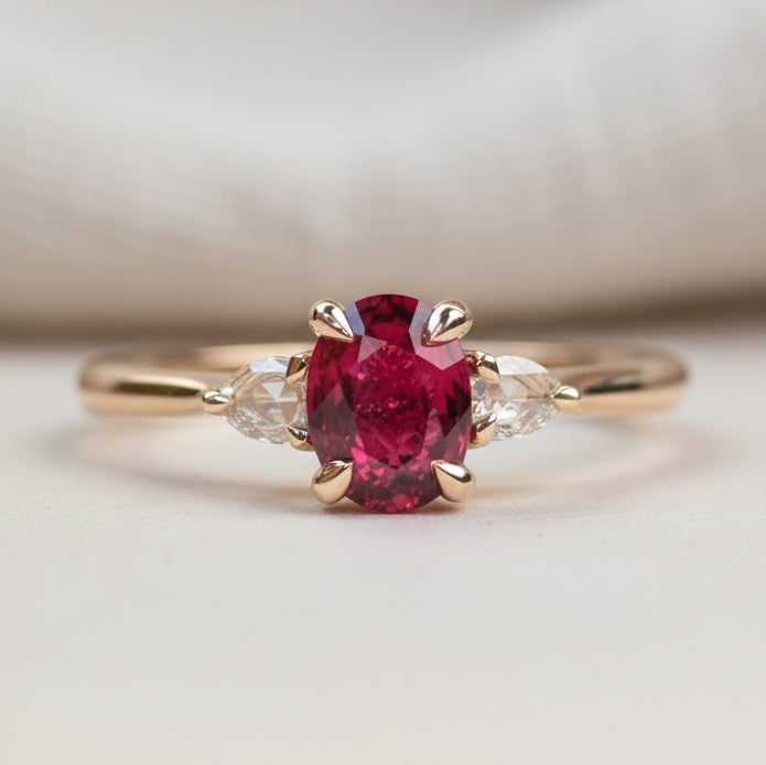 - Centerpiece: A 0.70-carat oval Mozambique ruby that exudes passion and elegance.