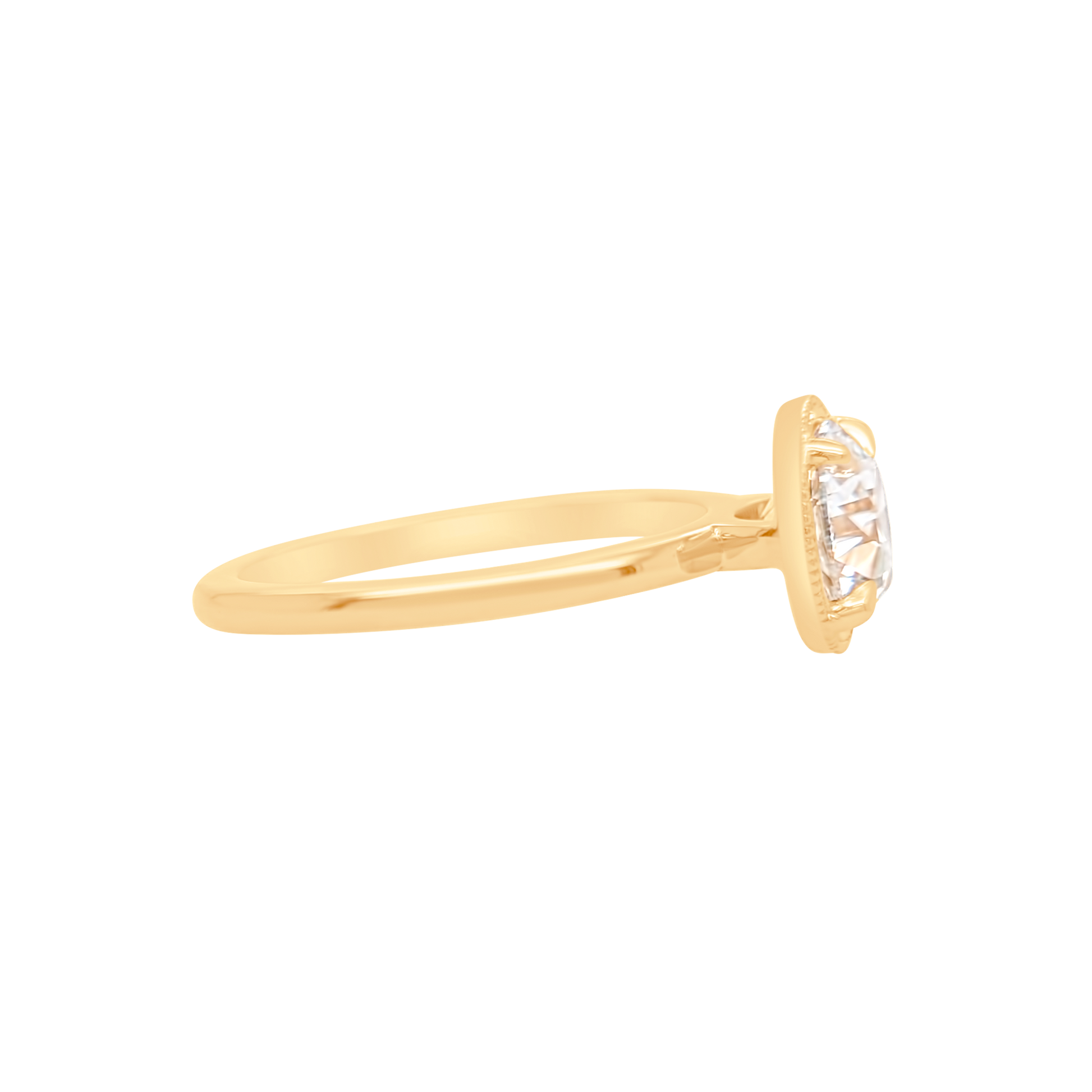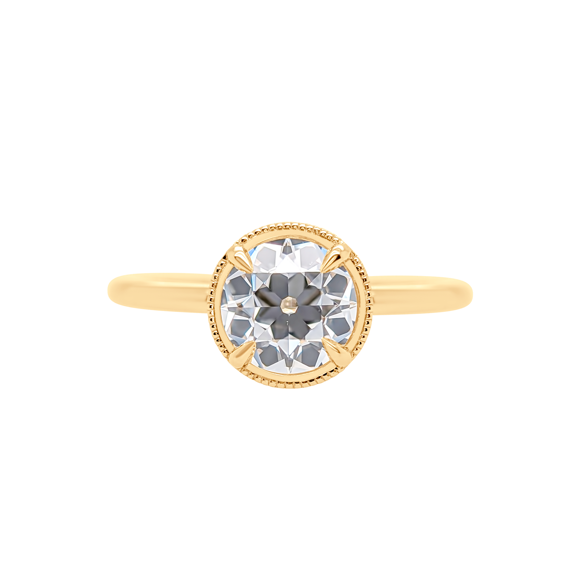 The four claws and milgrained illusion bezel are paired with a smooth half-round band which elevates this classic ring with a hint of antiquity. This setting is medium profile, and has been designed to be worn with your favourite stacking rings with no gapping.