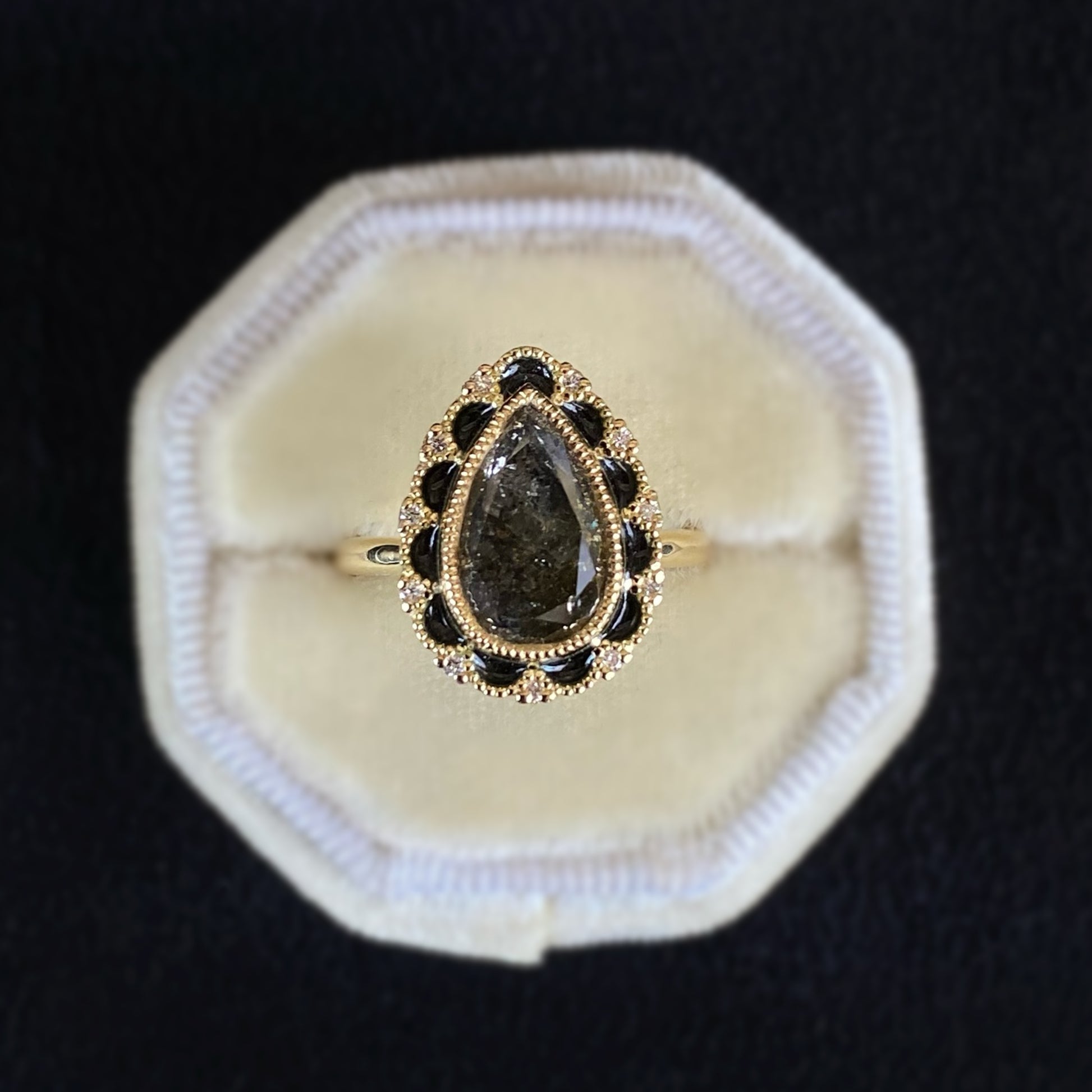 When you lay eyes on the Londyn ring, it will be love at first sight. The pear shaped diamond is absolutely stunning, and the salt and pepper diamond has such character and depth.