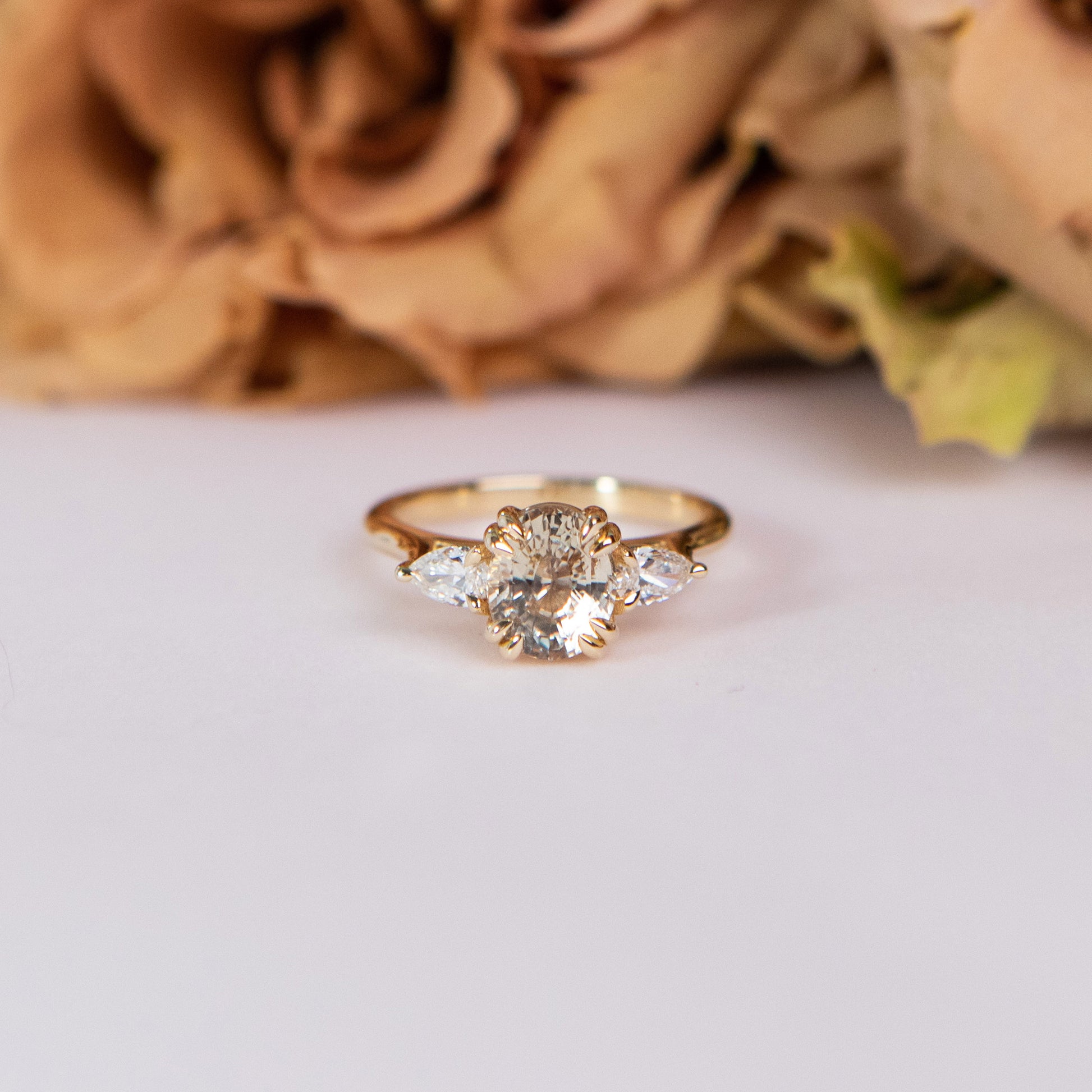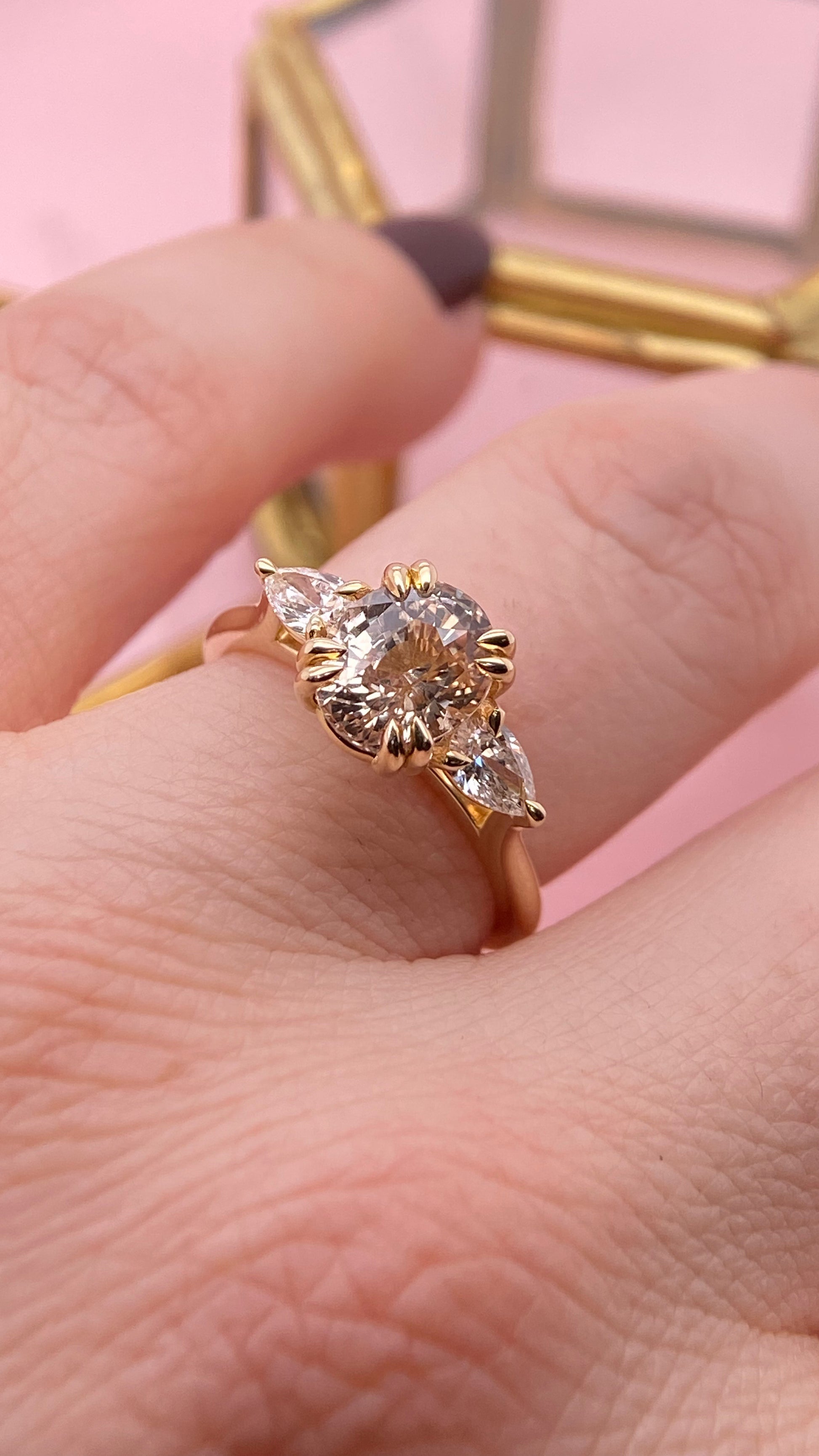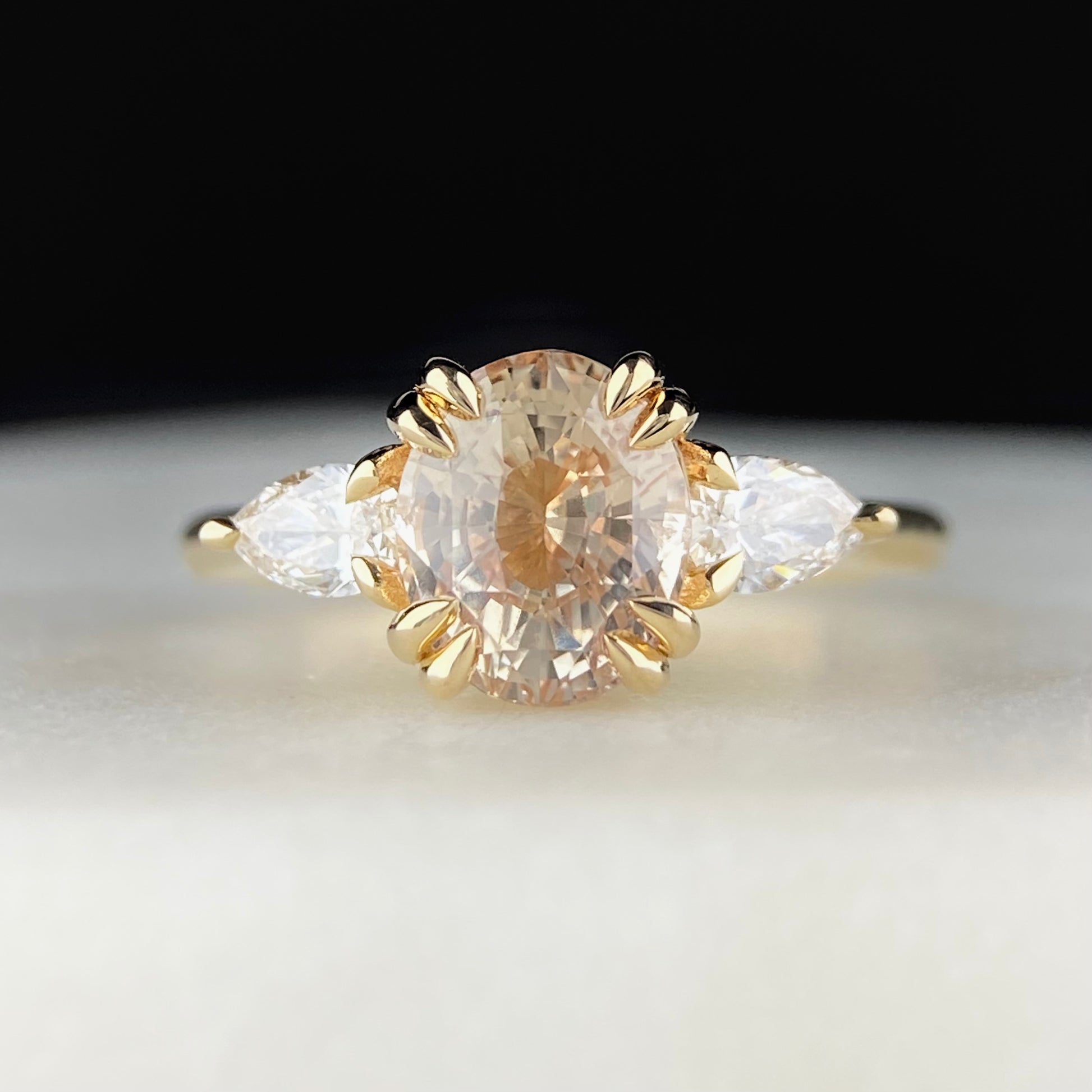 The cathedral setting of this engagement ring with sapphires is a classic, romantic gesture that stacks beautifully and sits comfortably low on the finger. The warm tones of the expertly cut peach sapphire are complemented by the brilliance of natural pear-shaped diamonds, creating a 3 stone diamond ring that's not just a piece of jewelry but a bespoke treasure to be adored for generations.