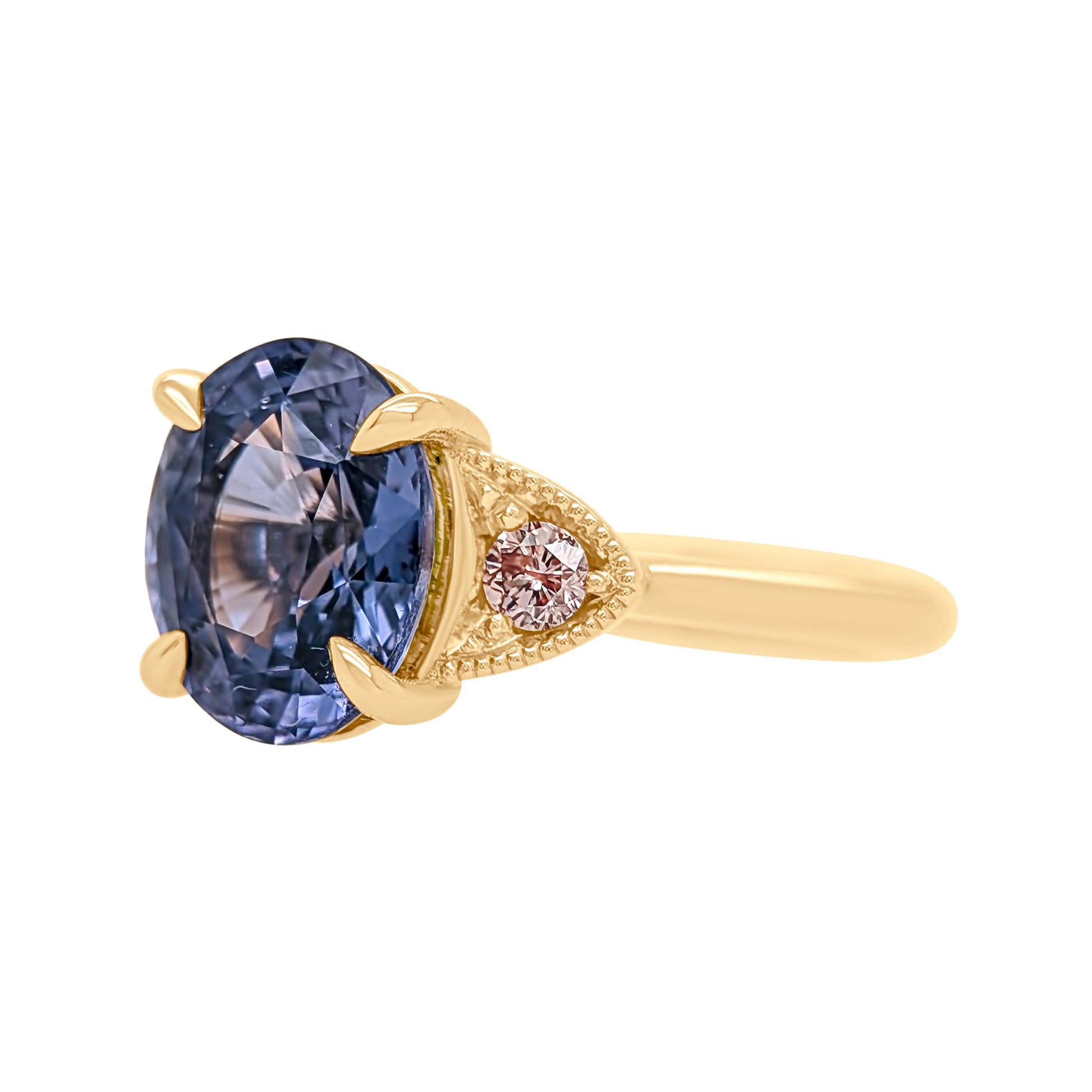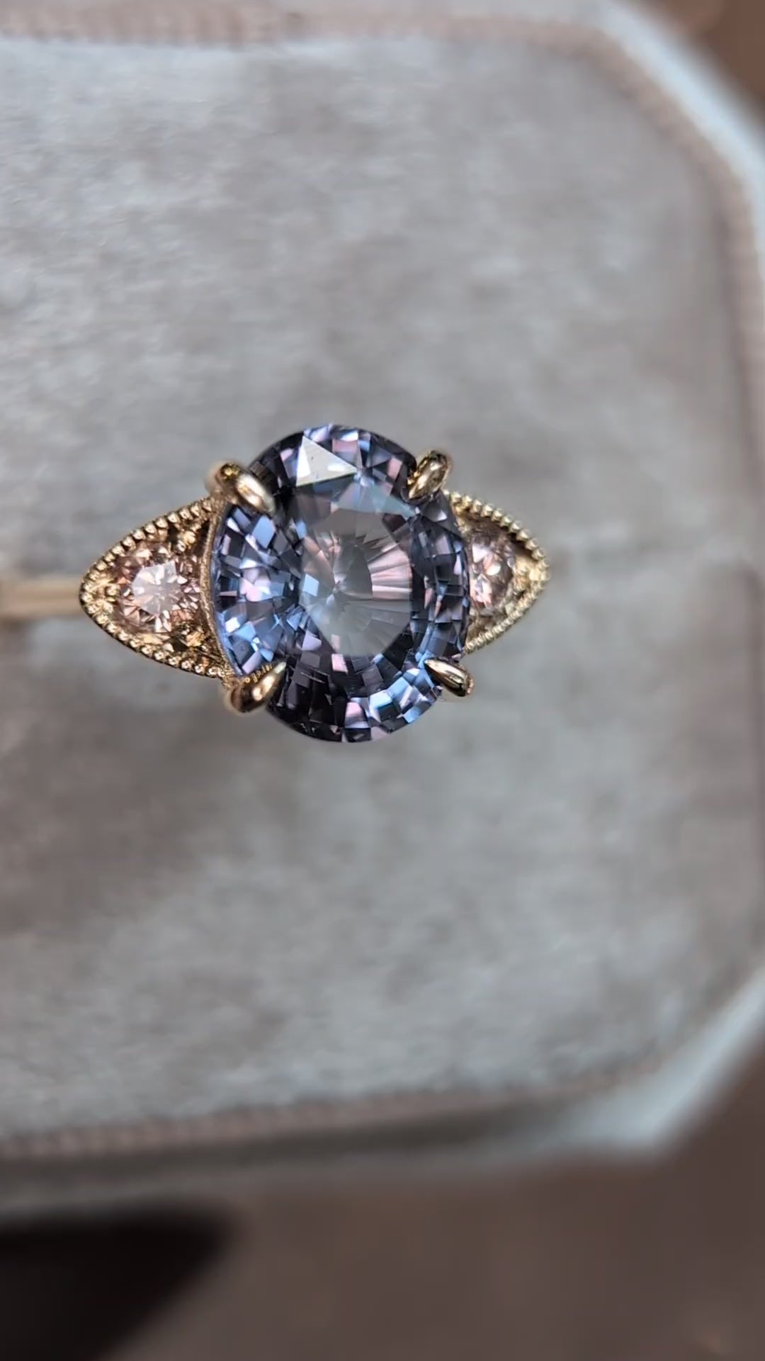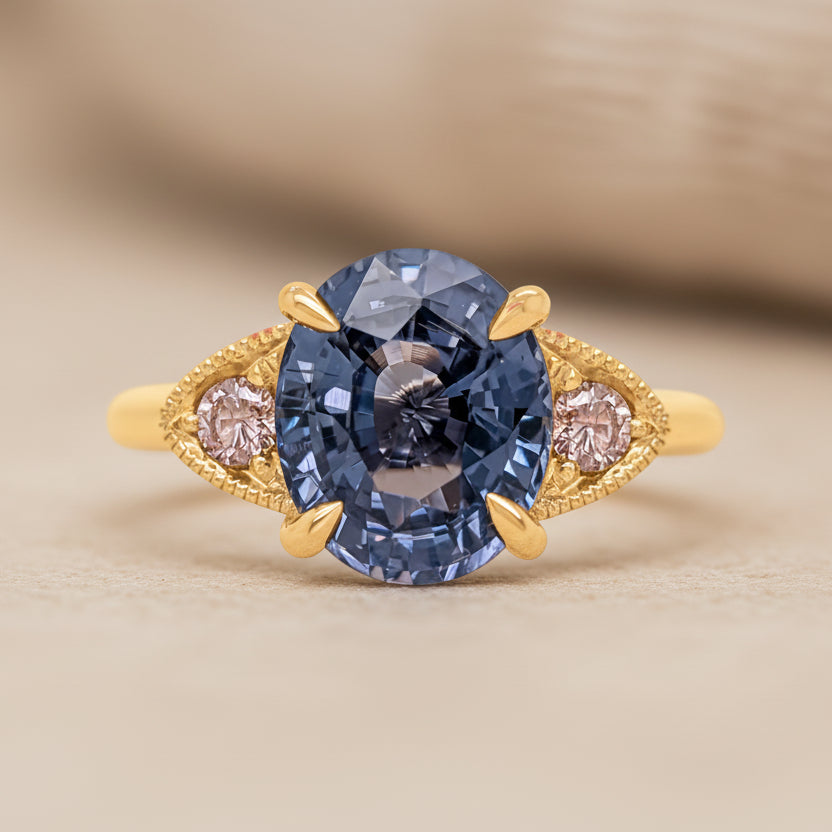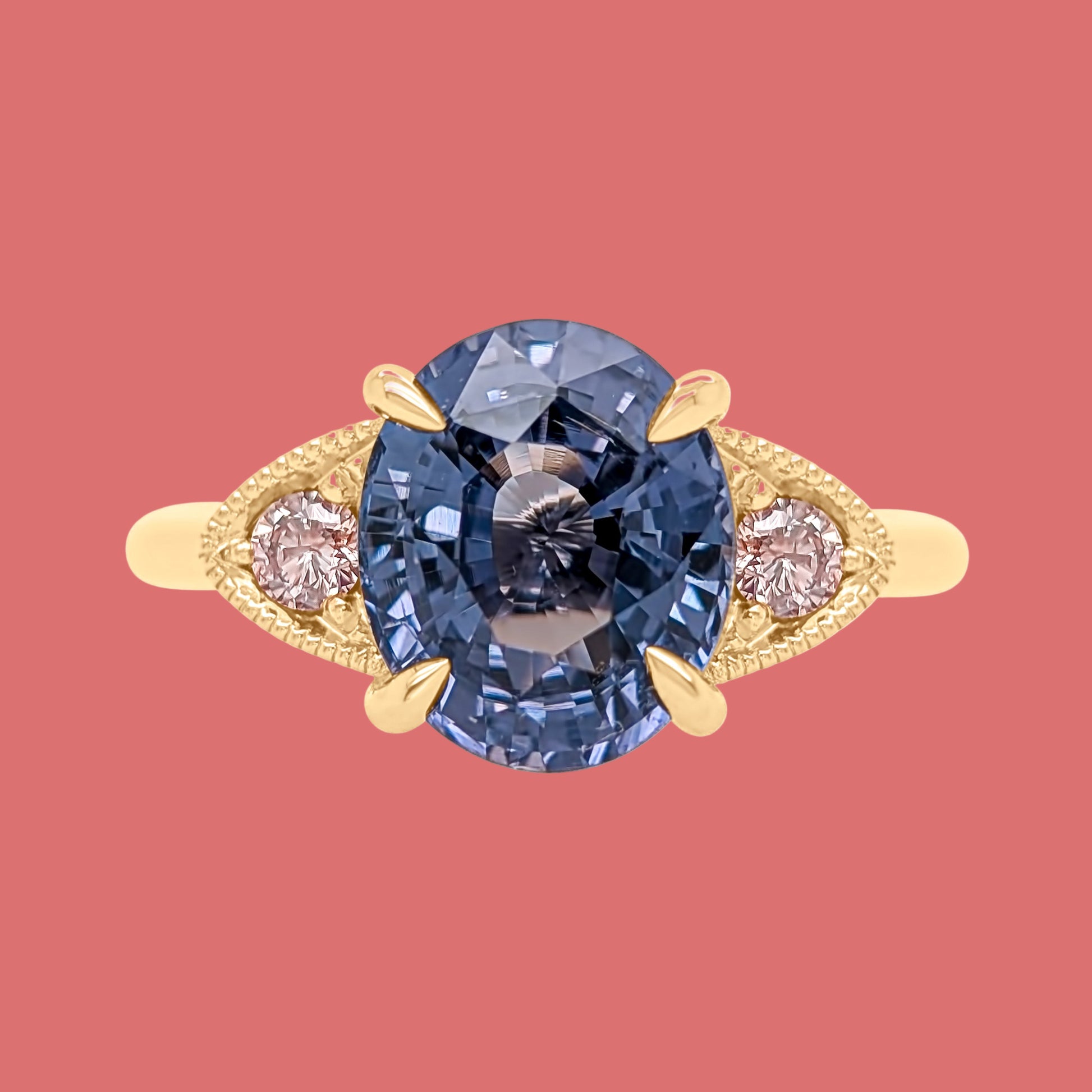 Flanking the spinel are two natural fancy light brownish-pink diamonds totaling 0.24ct. Their warm blush tones add a romantic glow, beautifully complemented by vintage-inspired milgrain accents that reflect EG Bespoke’s signature heirloom touch. Together, the gemstones create a soft, feminine palette that feels both refined and distinctive.