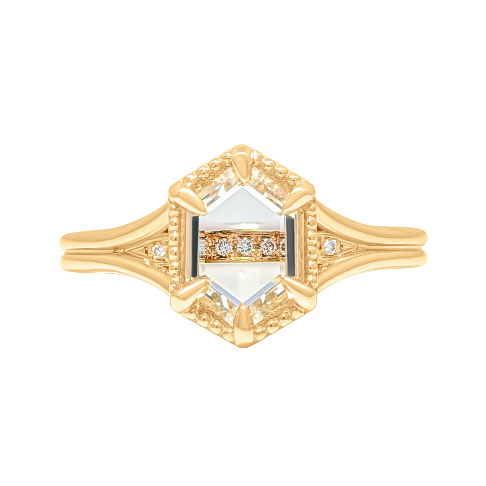 The Mirage Hexagon Setting embodies timeless artistry and balance. Its split-shank silhouette opens into a geometric harmony of form and light, revealing a delicate play between structure and softness. The hexagonal shape celebrates individuality, while milgrain accents trace the edge like a whisper of vintage refinement. Every curve has been shaped to honor both precision and soul — an heirloom in the making.