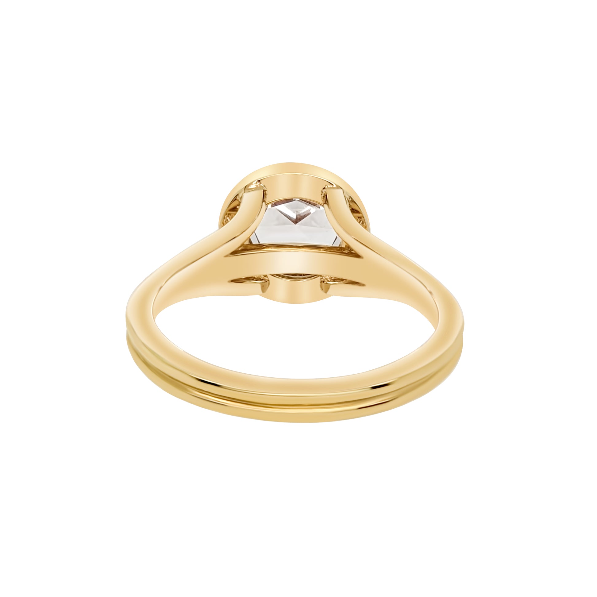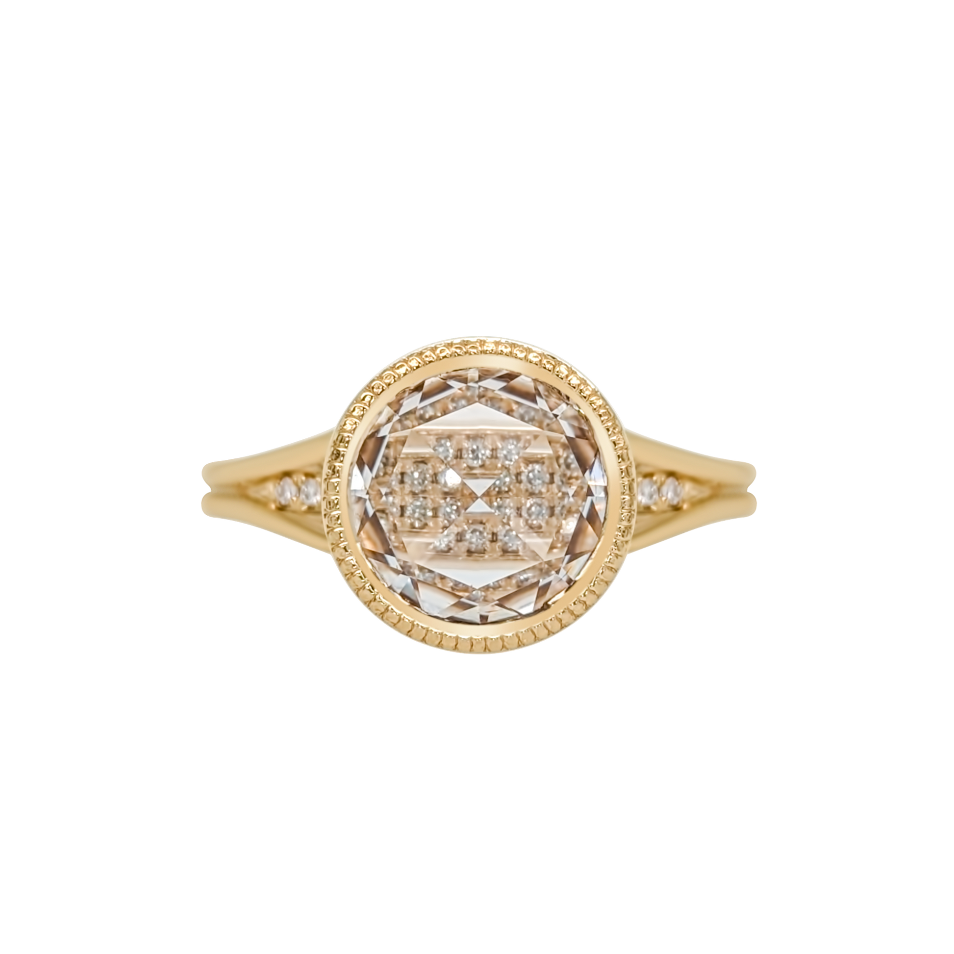 This unique classic engagement ring features a split shank design that reveals a path of tiny diamonds hidden beneath the chunky facets of a rose cut stone. A rose cut sapphire or diamond of any shape is the perfect marriage of vintage style and classic elegance. Set in a delicately miligrained bezel setting, light, windows and transparency turn this precious gemstone and diamonds into a kaleidoscopic curiosity for a one of a kind bride. Low profile and comfortable, this ring will stack with a lightly curved band.