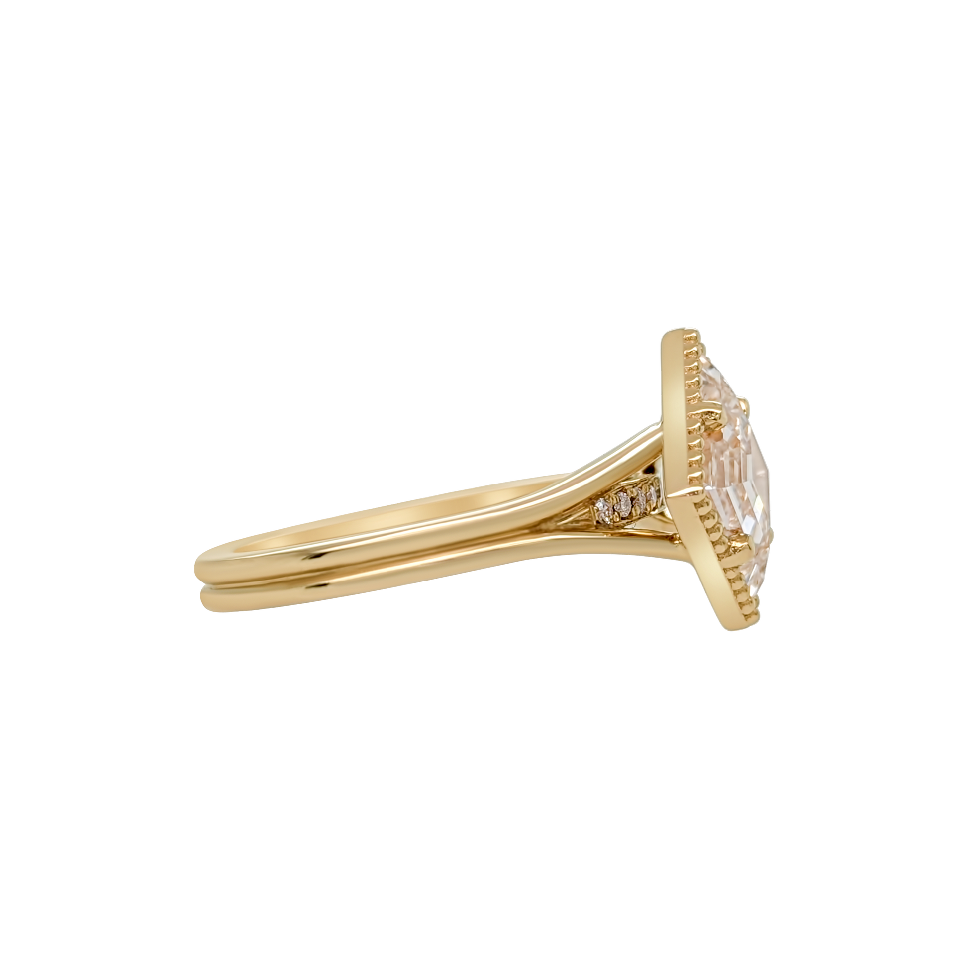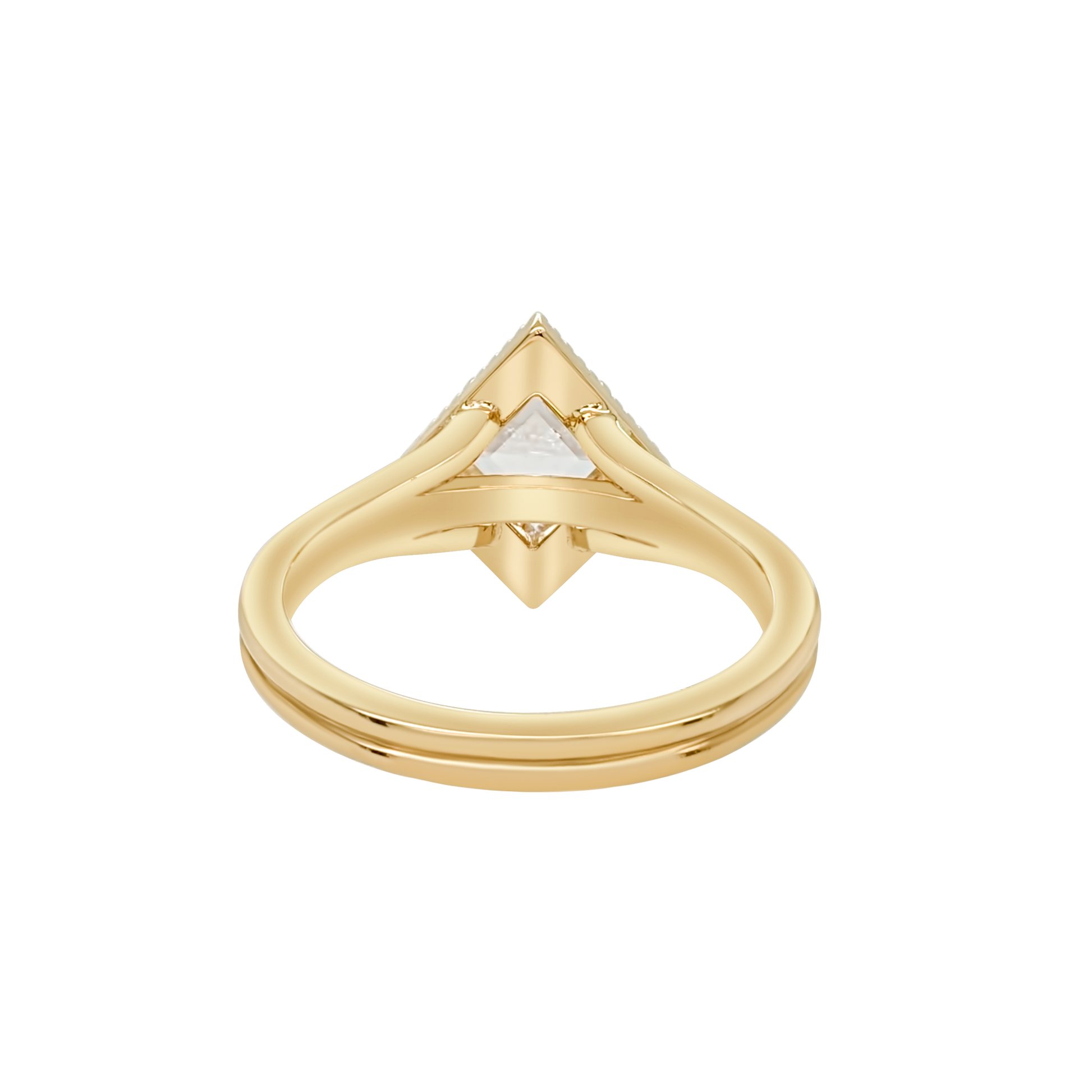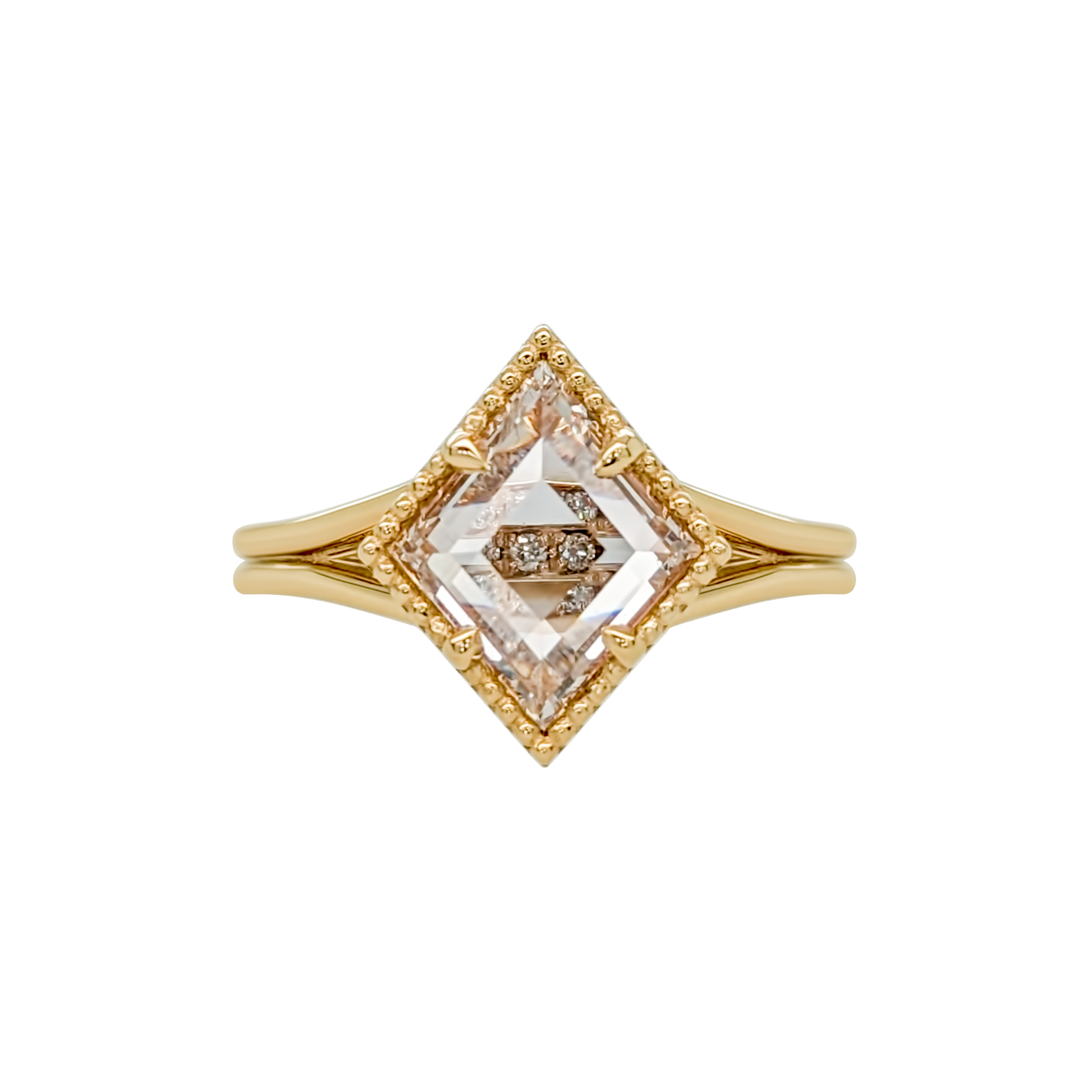 This unique classic engagement ring features a split shank design that reveals a path of tiny diamonds hidden beneath the chunky facets of a rose cut stone. A rose cut sapphire or diamond of any shape is the perfect marriage of vintage style and classic elegance. Set in a polished frame and 6 prong setting, light, windows and transparency turn this precious gemstone and diamonds into a kaleidoscopic curiosity for a one of a kind bride. Low profile and comfortable, this ring will stack with a lightly curved band.
