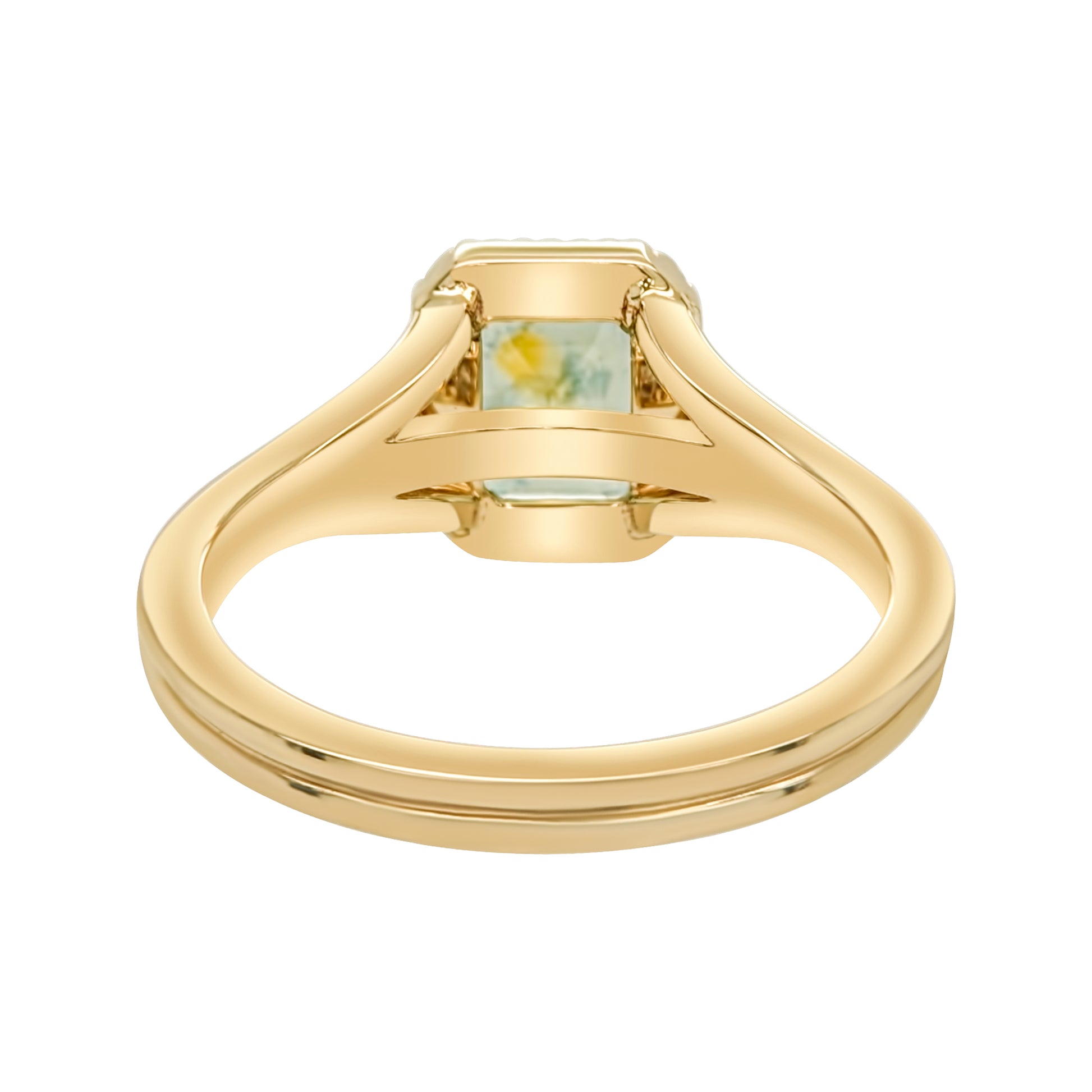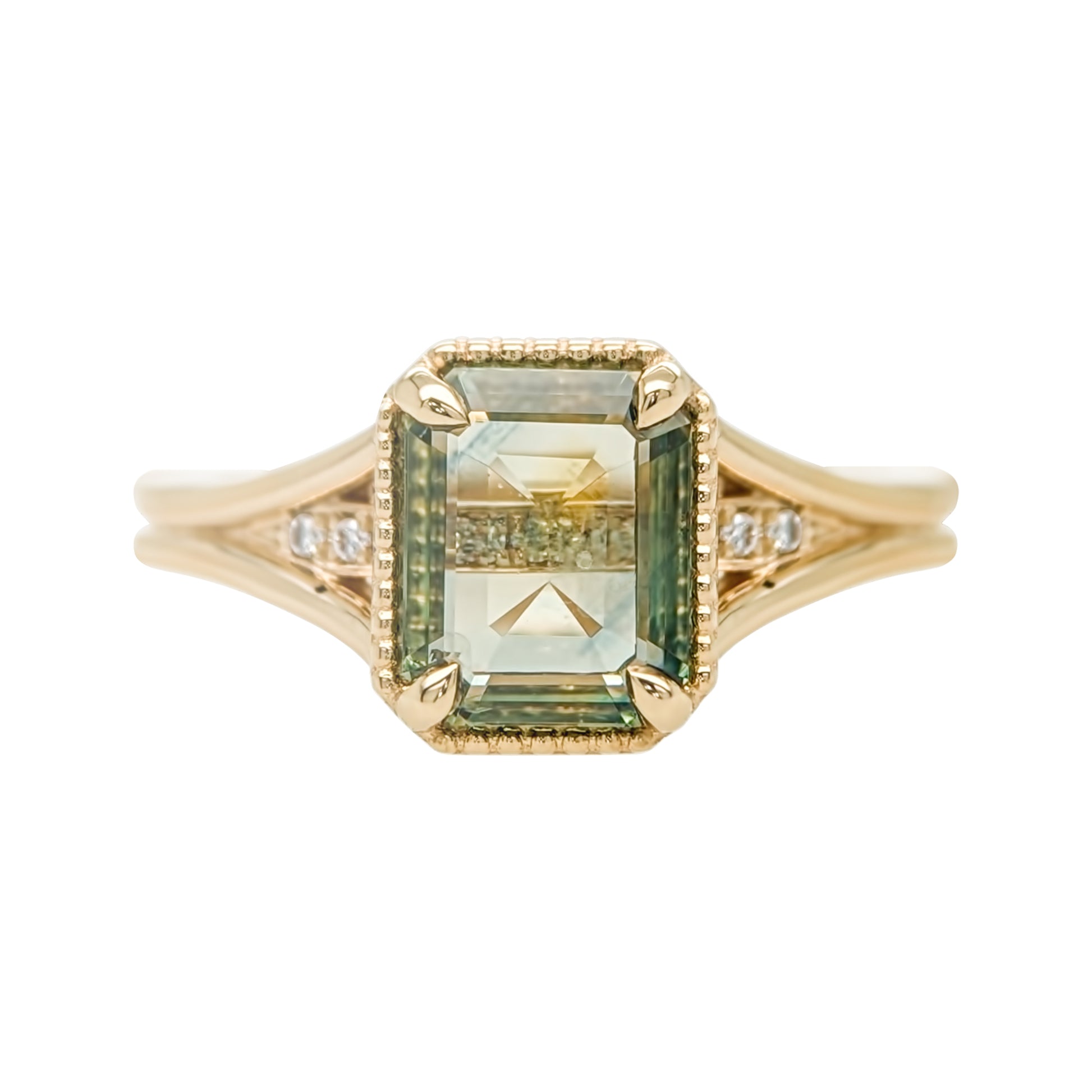 Discover the enchantment of springtime with every glance at your hand, thanks to the captivating allure of this fresh green Montana Sapphire engagement ring. The innovative split shank design of this ring unveils a secret cascade of twinkling diamonds, nestled beneath the lustrous surface of the cut corner rectangle portrait cut sapphire. Named Oliva, this ring's fluid band, delicate claw prongs, and the whimsical dotted milgrain frame come together in a symphony of design, creating an antique style engagement ring that's not just jewelry but a wearable masterpiece.