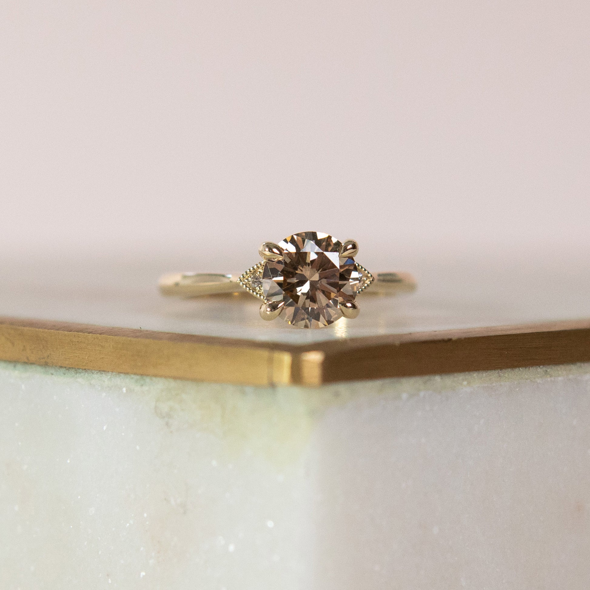 This champagne diamond ring is a toast to love, featuring a rare champagne diamond that glows with an otherworldly beauty reminiscent of a perfect Southern cocktail.