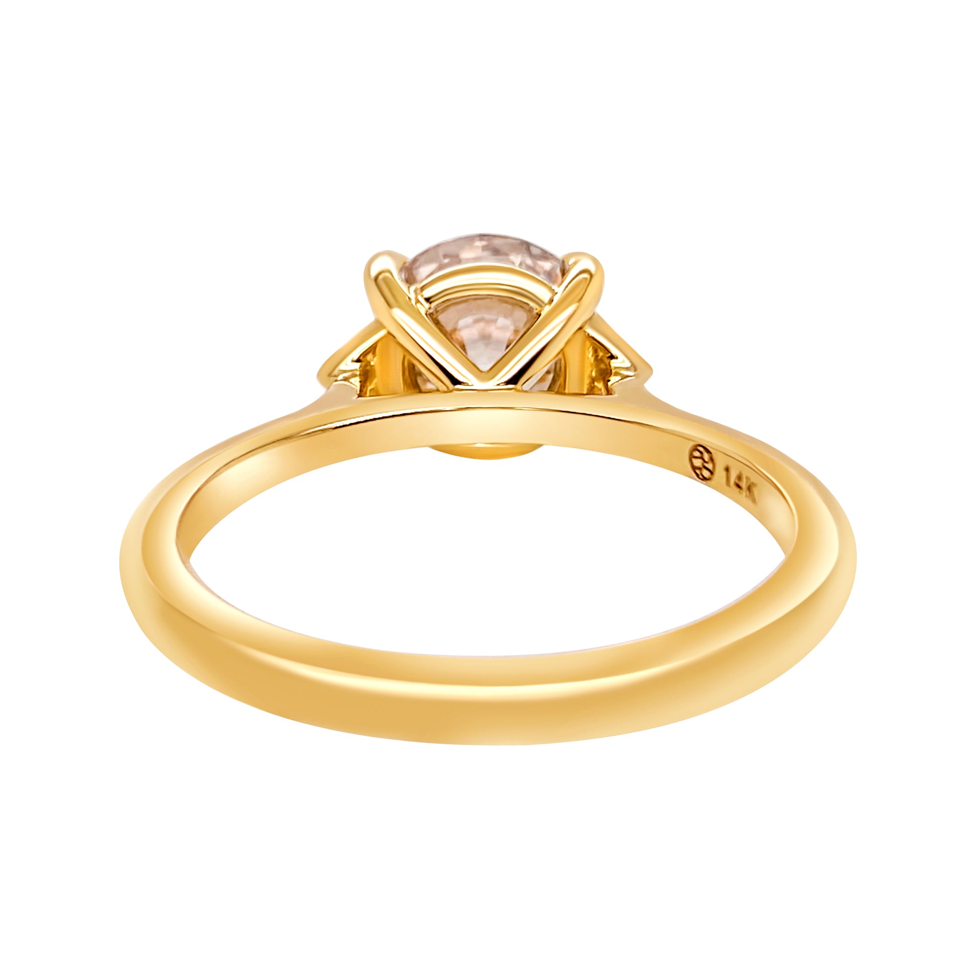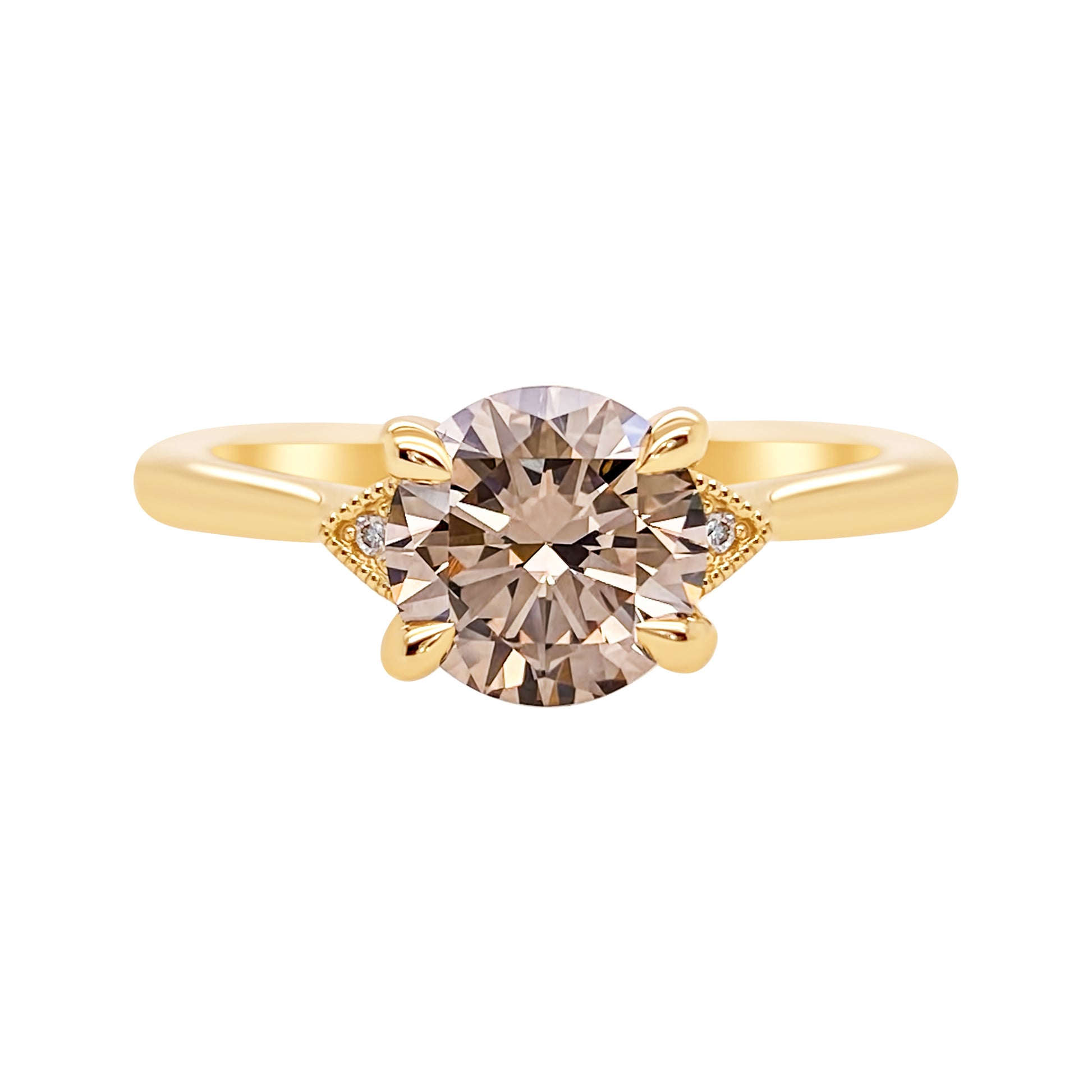 Crafted with a round brilliant cut diamond at its center, this champagne diamond engagement ring sparkles with a spectrum of rainbow prisms, each facet designed to catch the light and the eye.
